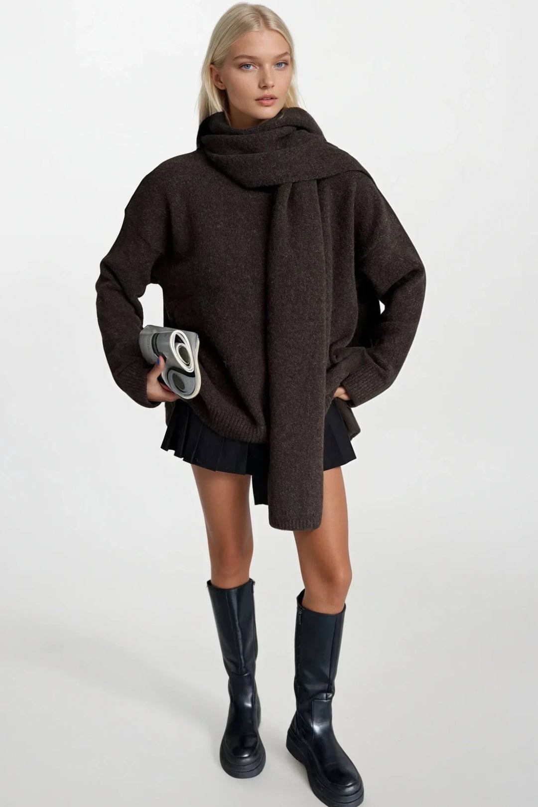 Atkı Detay Dokulu Kahverengi Triko Kazak İkili Takım
