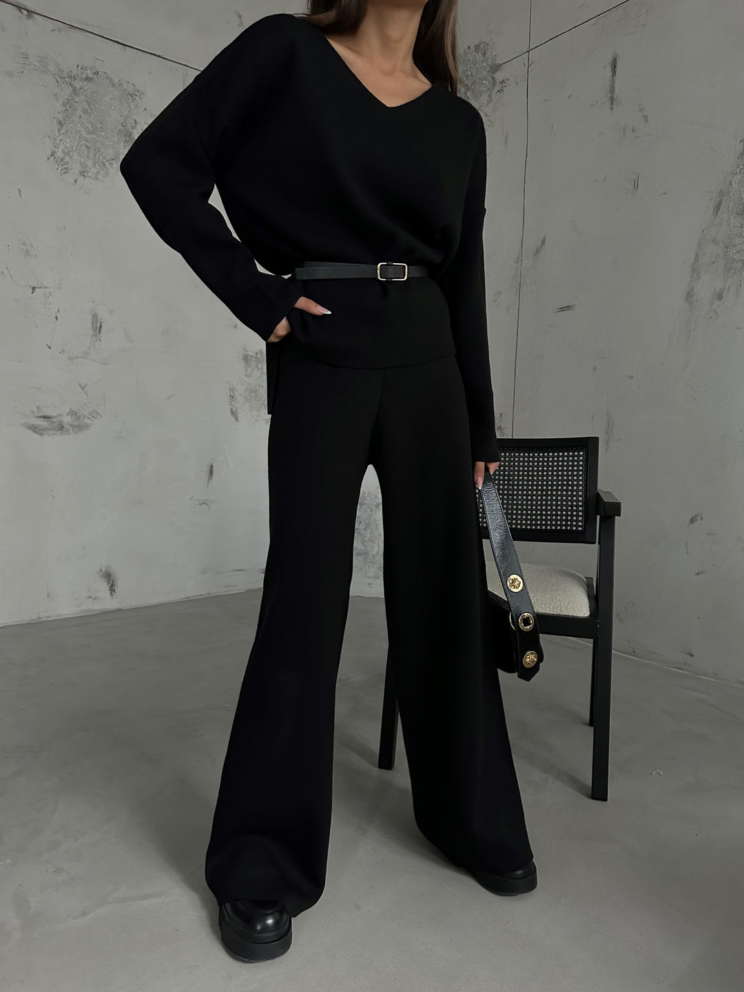 V Yaka Triko Siyah Kazak Pantolon Takım