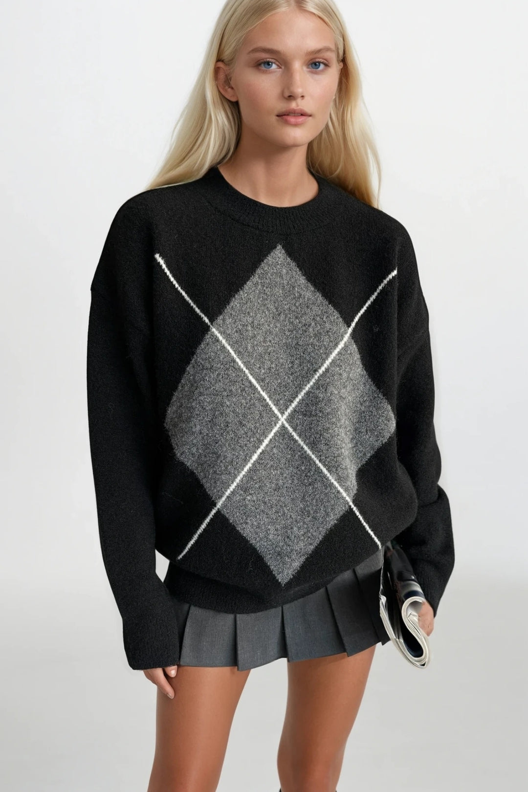 Baklava Desen Bisiklet Yaka Siyah Triko Kazak