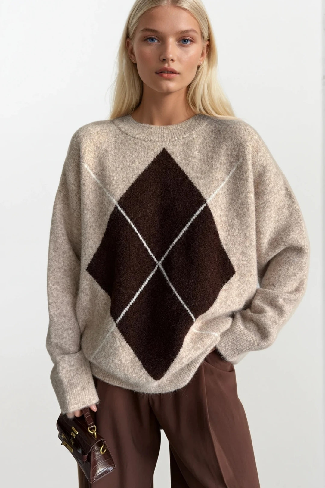 Baklava Desen Bisiklet Yaka Bej Triko Kazak