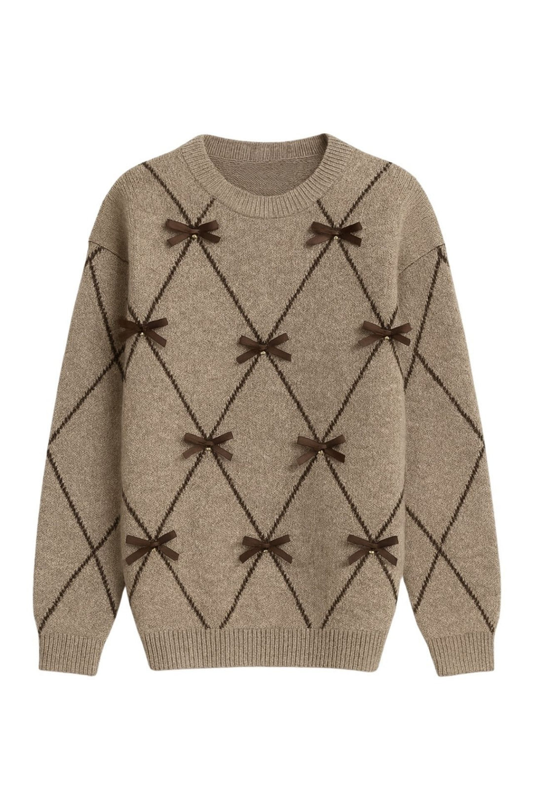 Baklava Desen Taş İşlemeli Fiyonklu Vizon Kazak