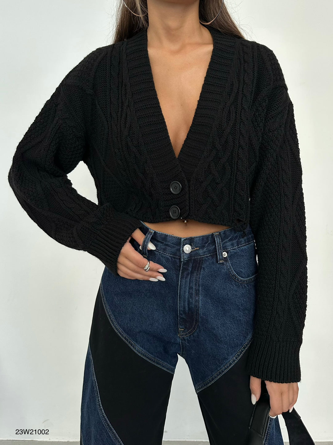Baklava Desen Siyah Crop Saçaklı Hırka