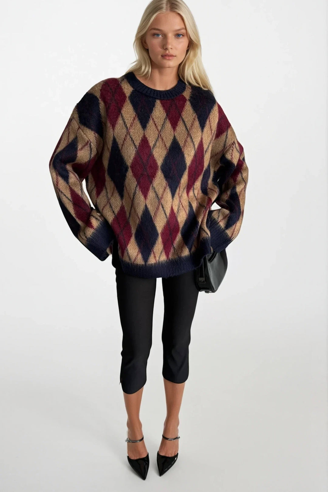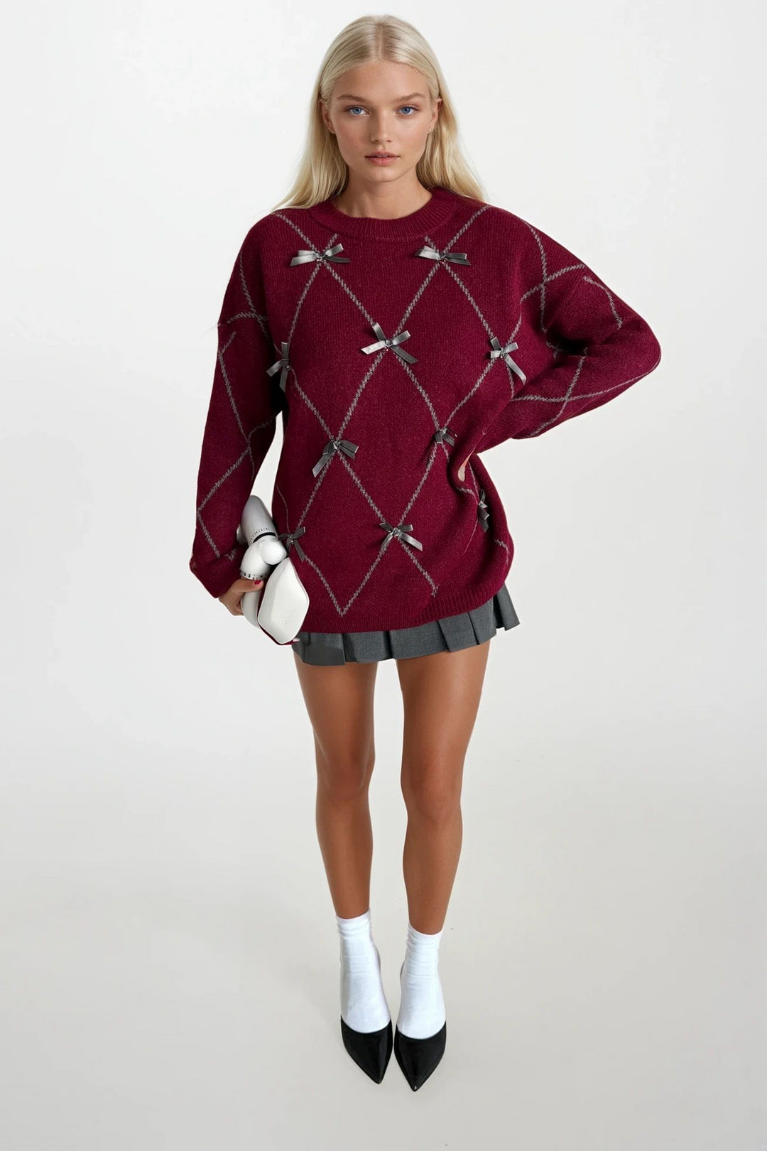 Baklava Desen Taş İşlemeli Fiyonklu Bordo Kazak
