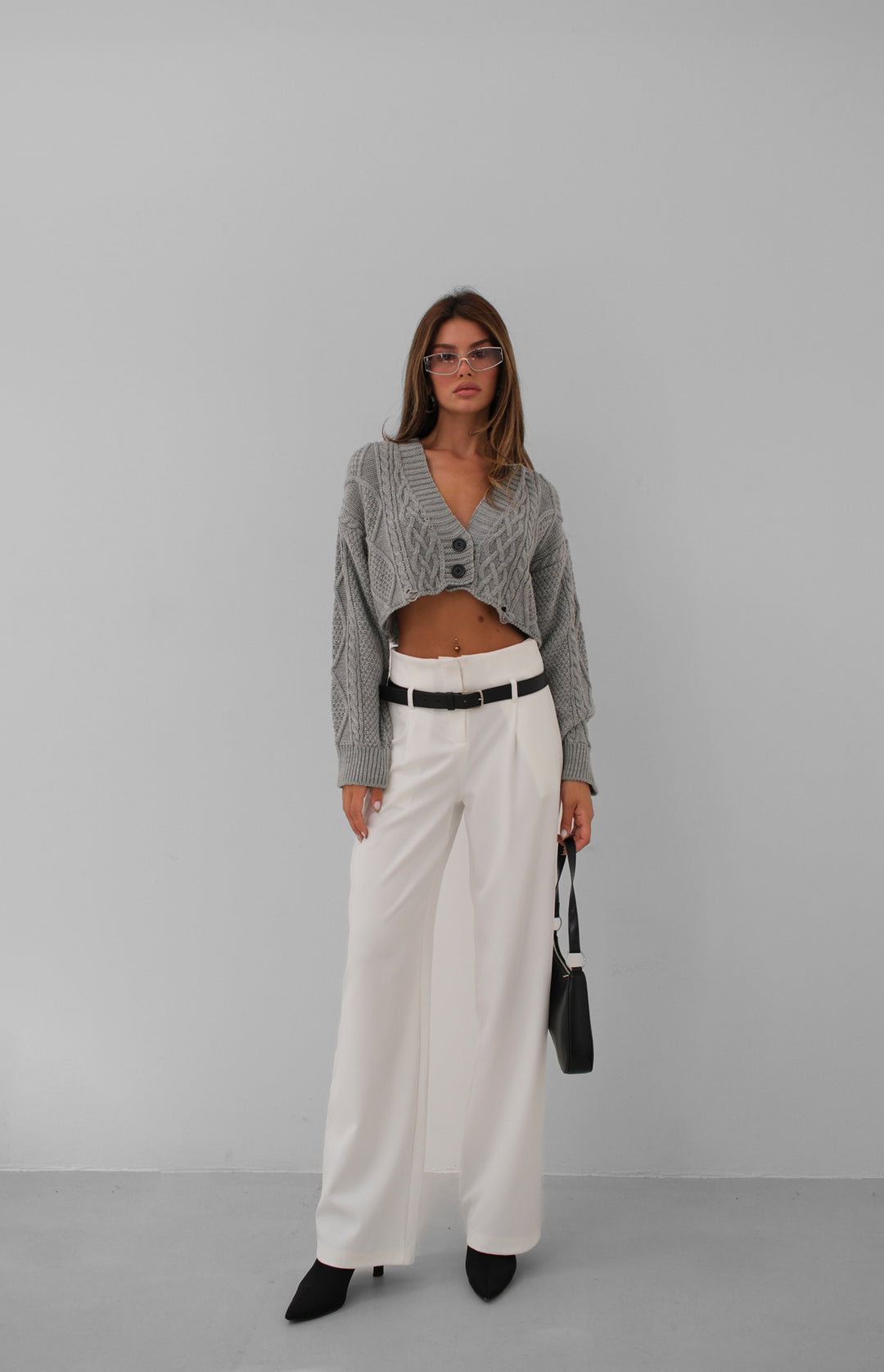 Baklava Desen Ekru Crop Saçaklı Hırka