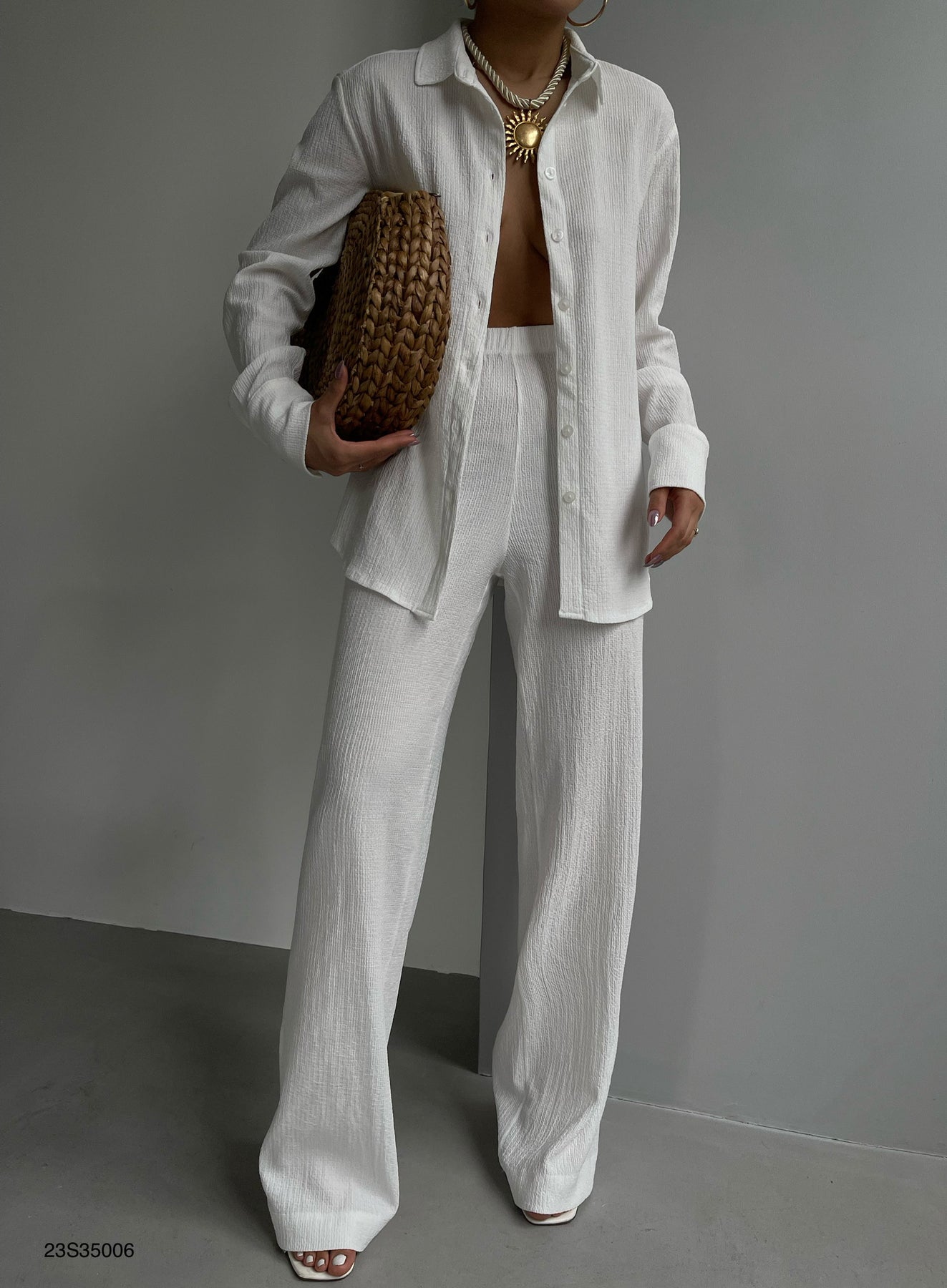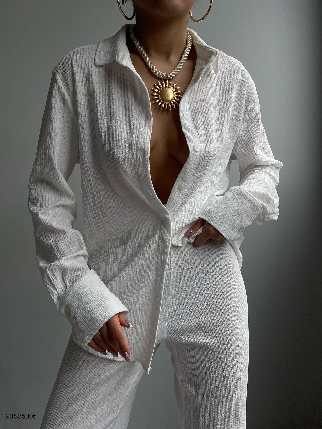 Uzun Kollu,Düğmeli, Uzun Boy Gömlek veYüksek Bel, Bel Lastikli Pantolon İkili Takım