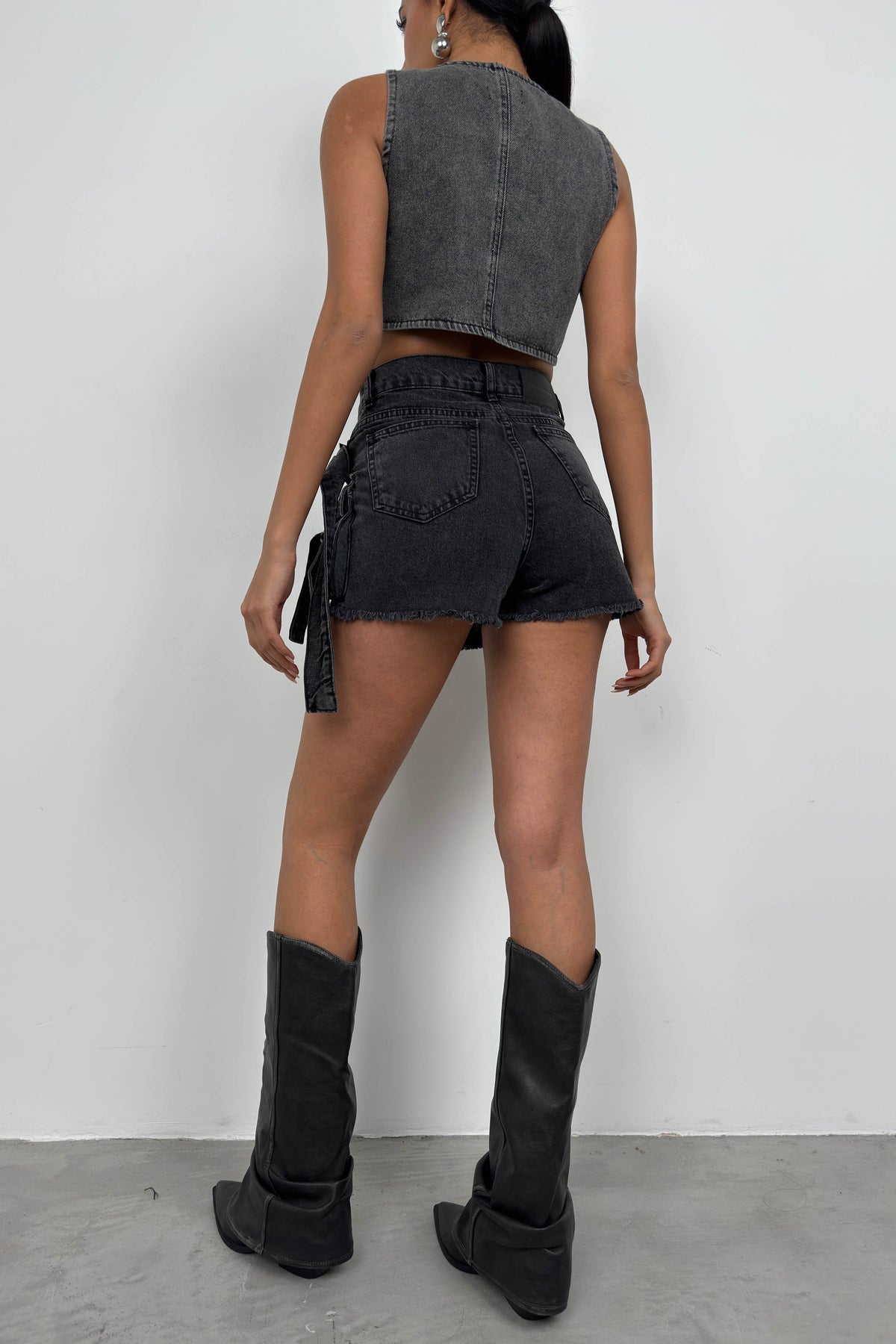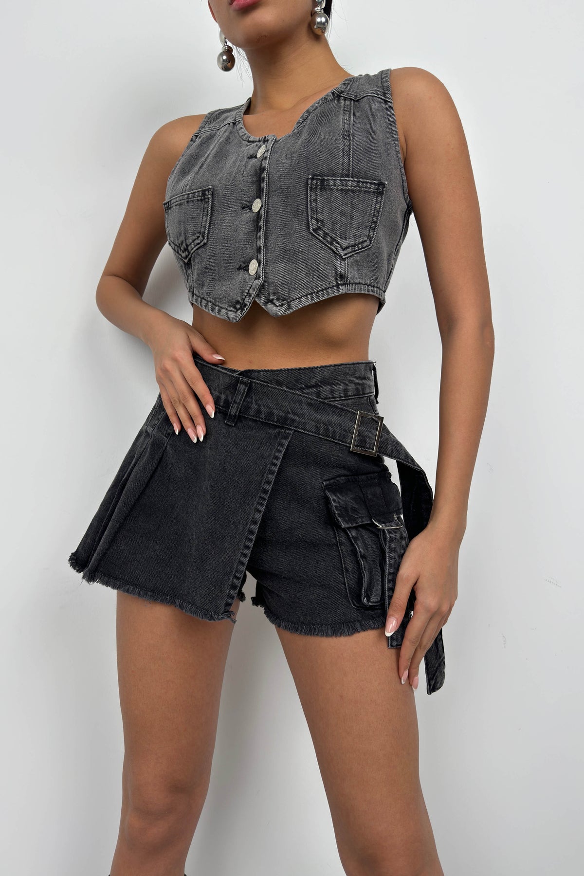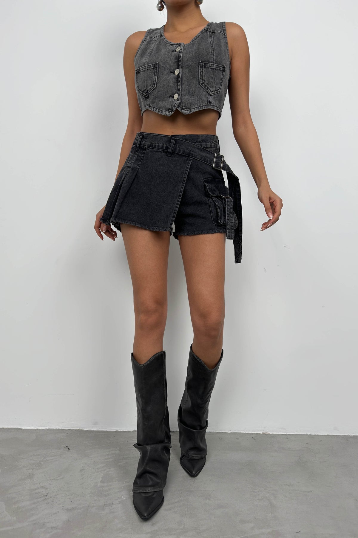Kargo Cep Kemer Detay Gri Kot Şort Etek