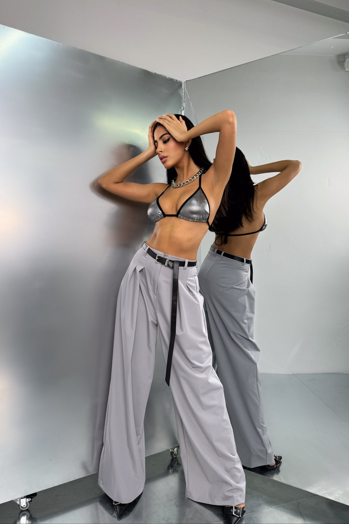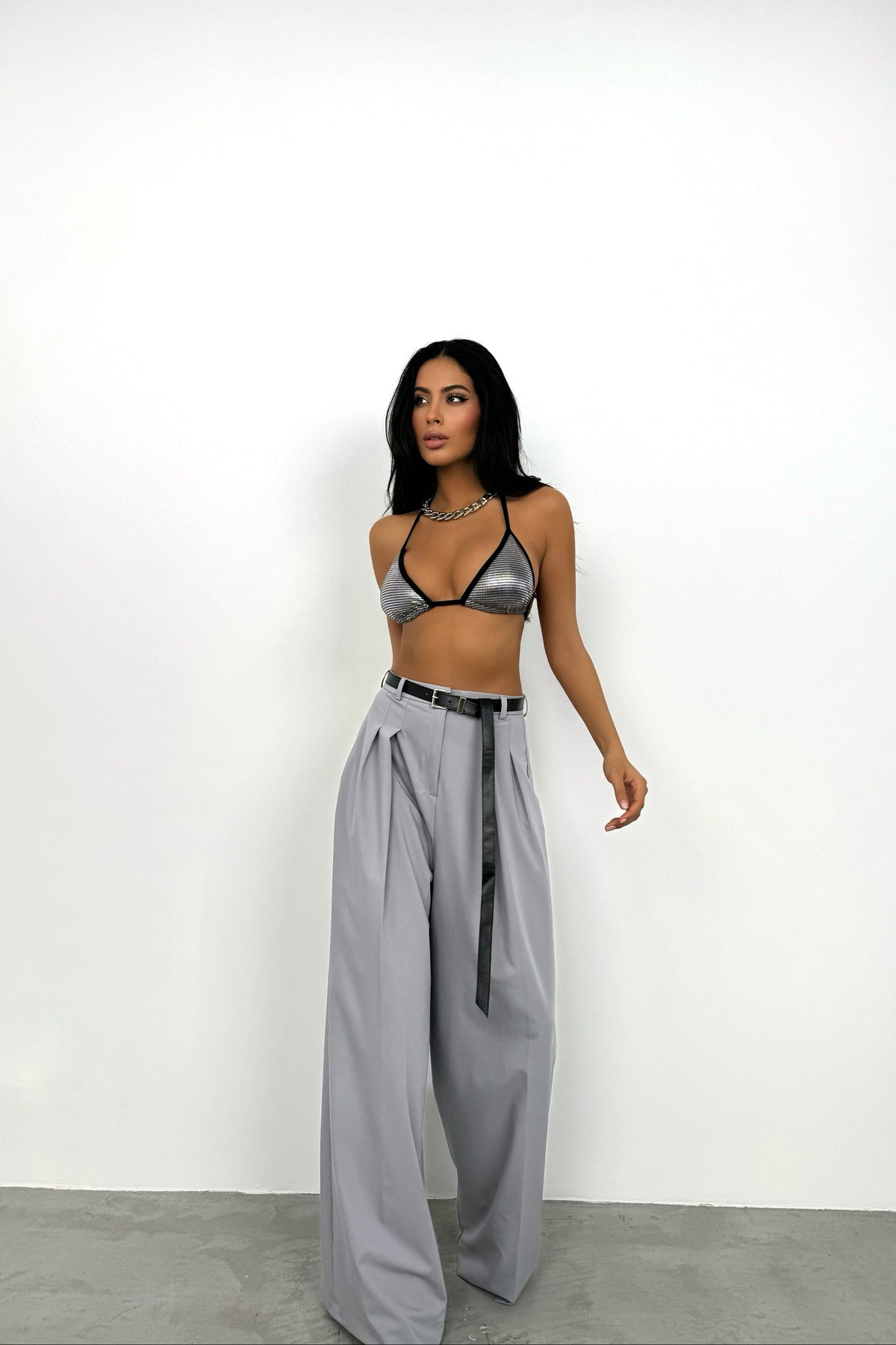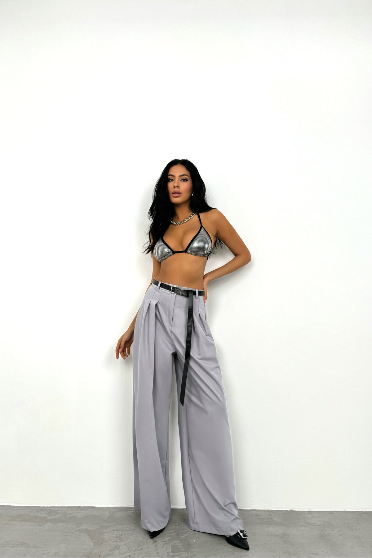Pile Detay, Yüksek Bel, Bol Paça, Kemerli, Pantolon