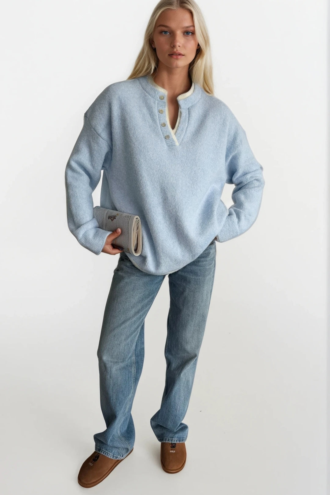 Düğme Detay Basic Mavi Triko Kazak
