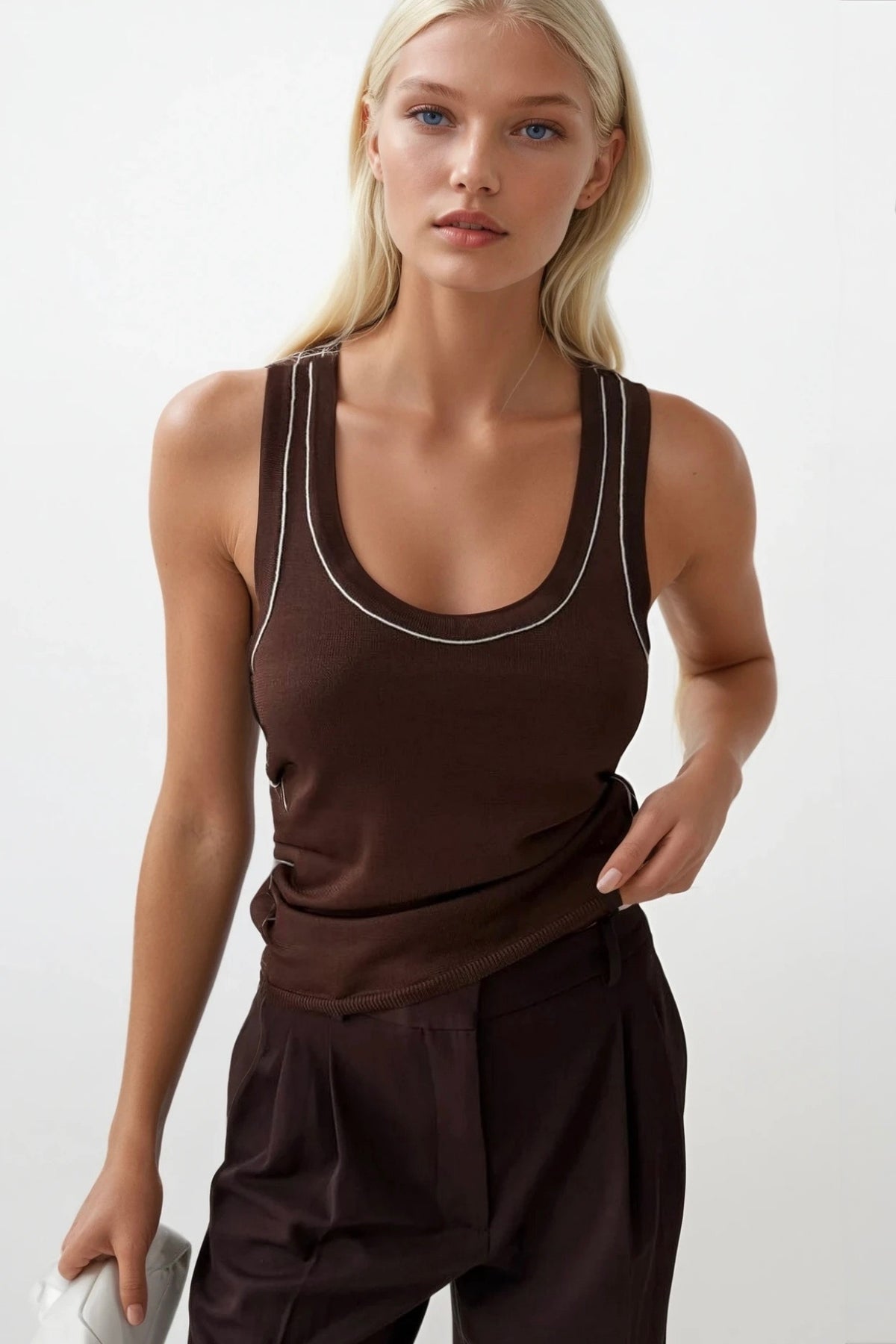 Biye Detay Halter Yaka Kahverengi Beyaz Bluz