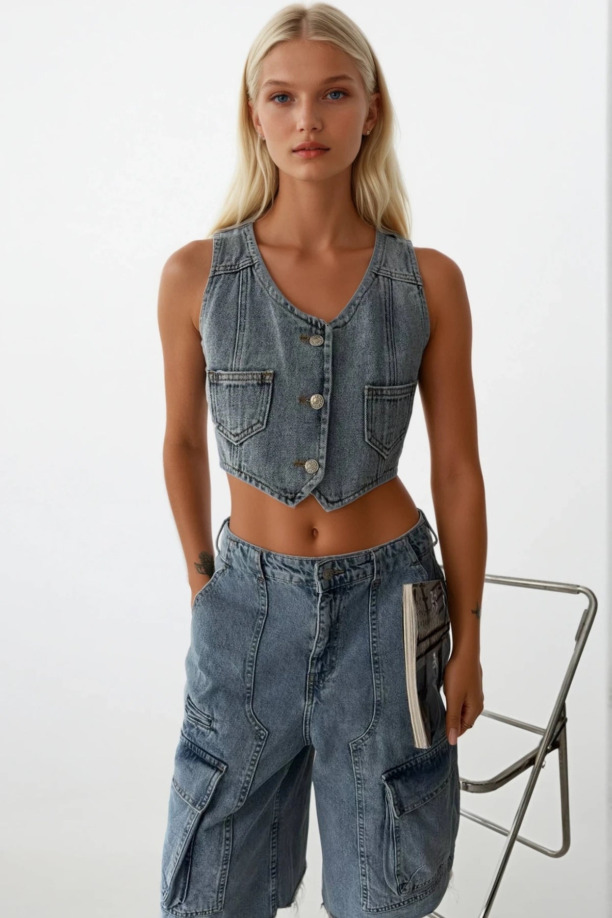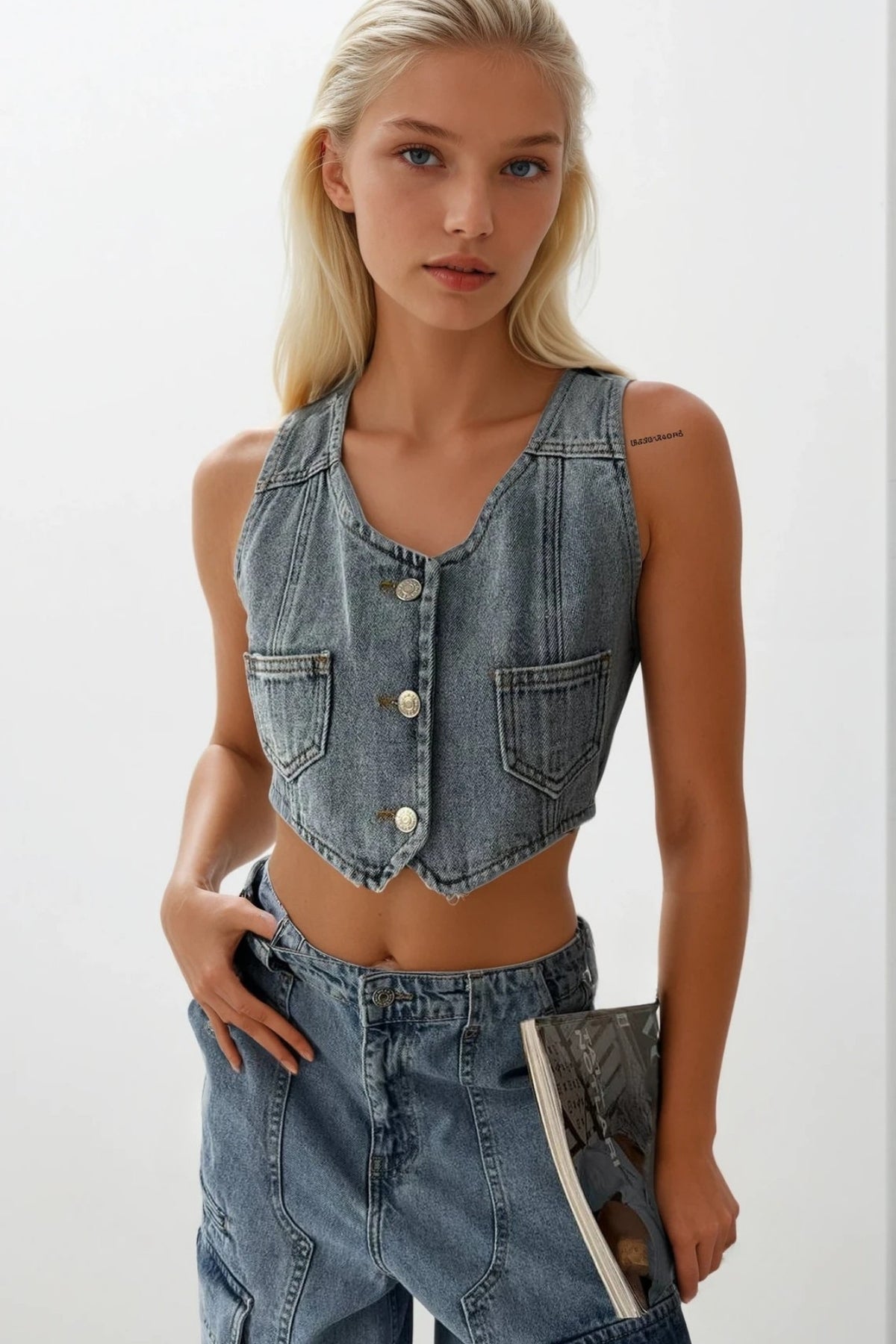 Cepli, Denim, Metal Düğmeli, Oval Kesim, Yelek