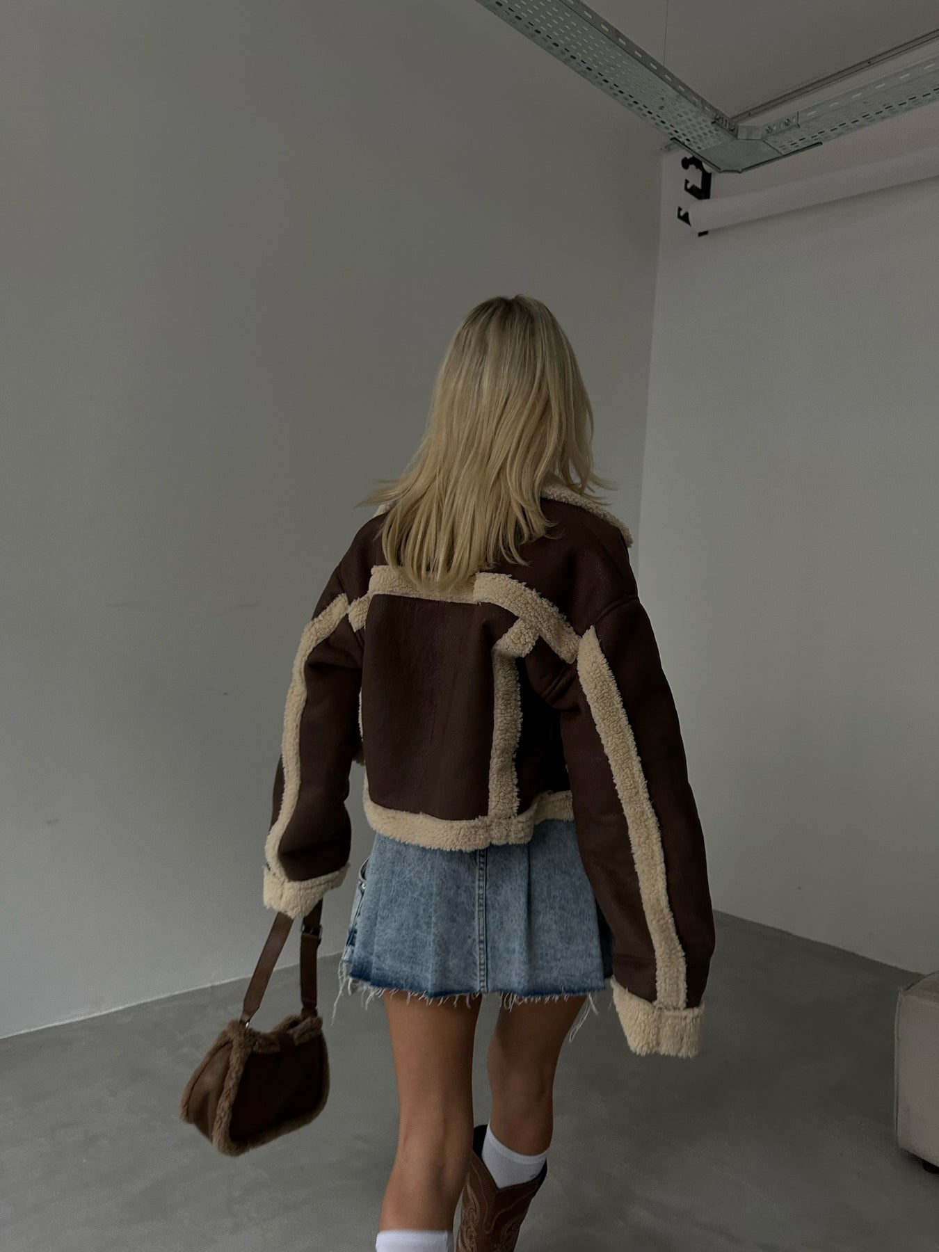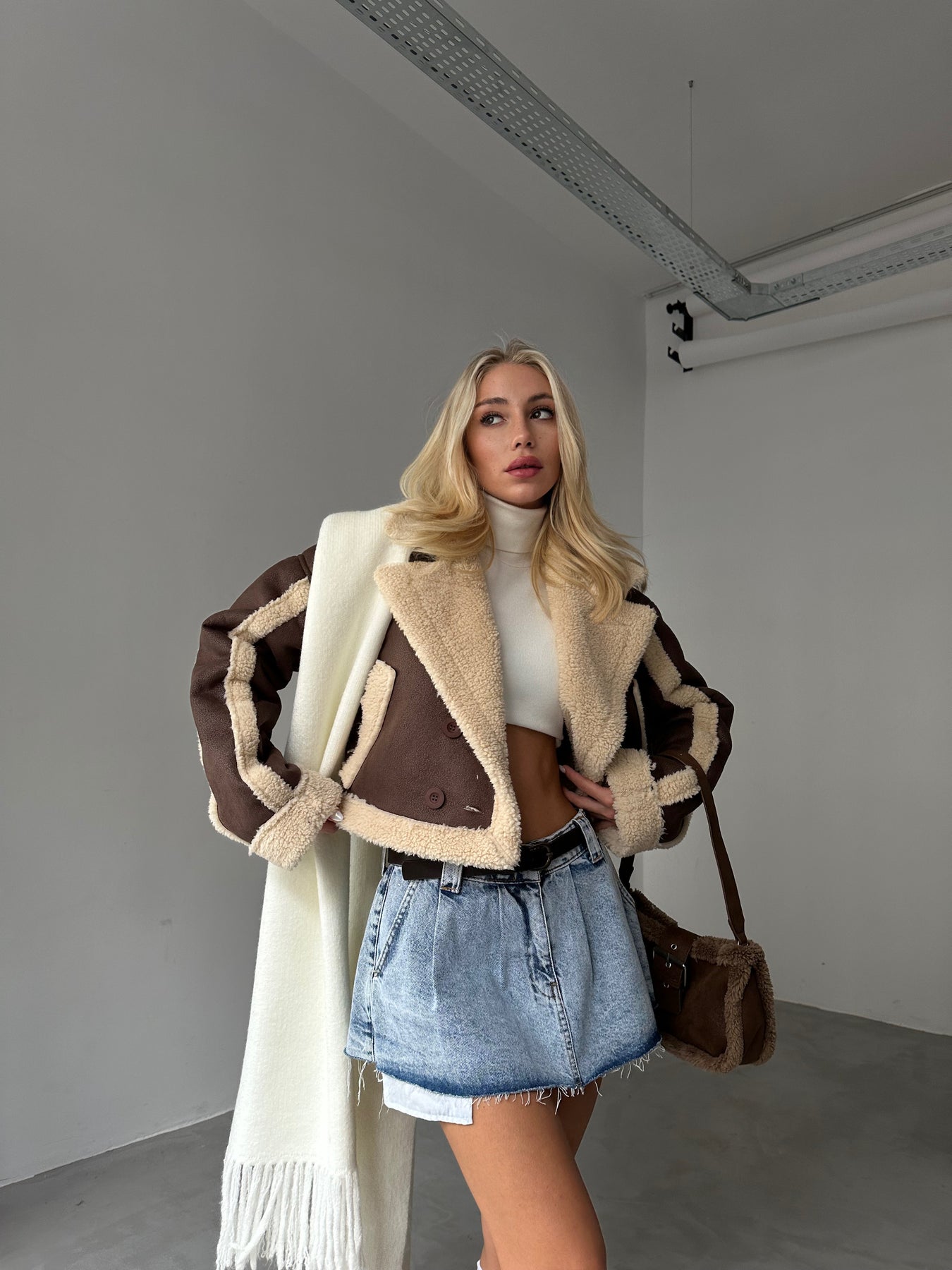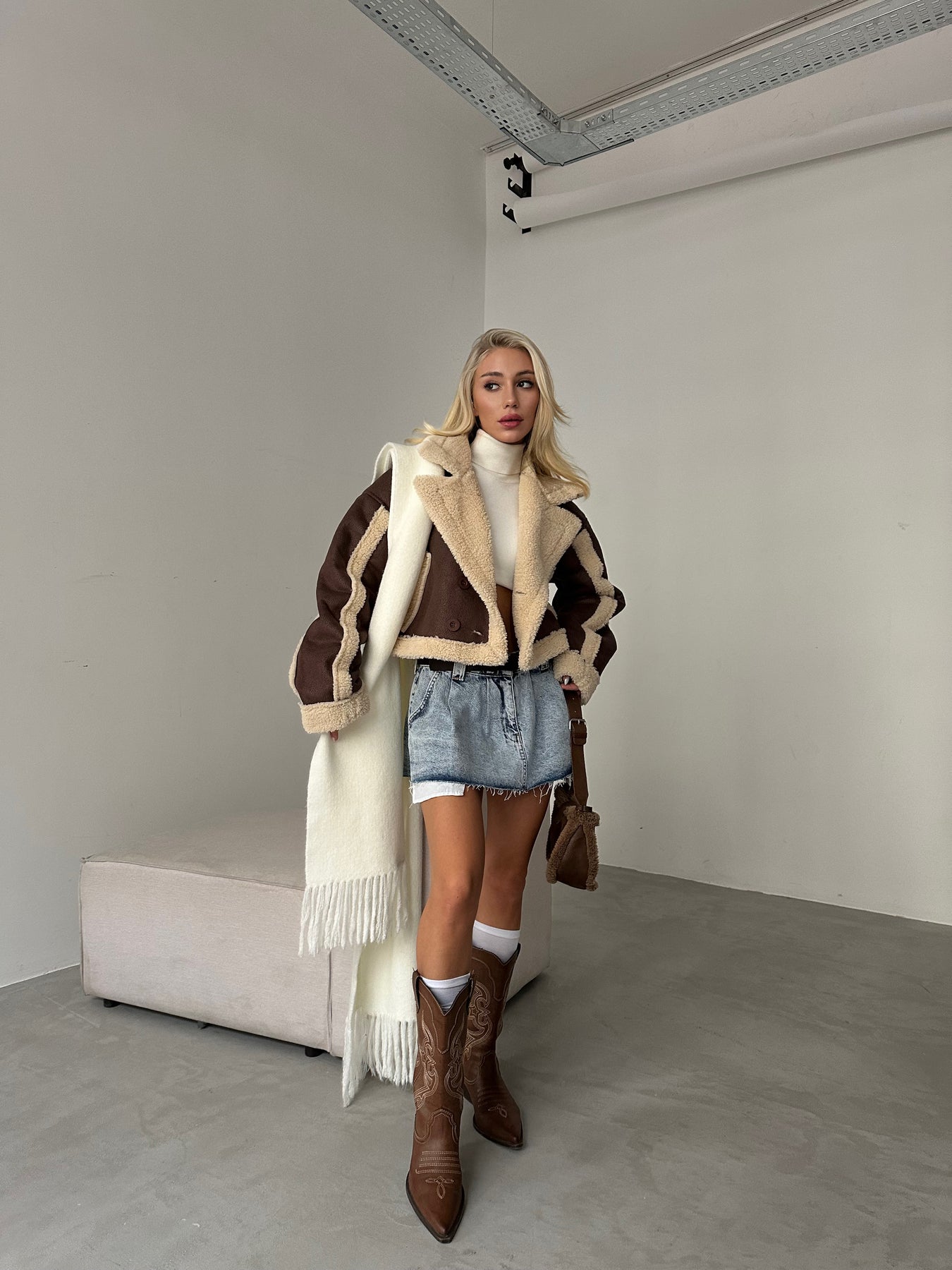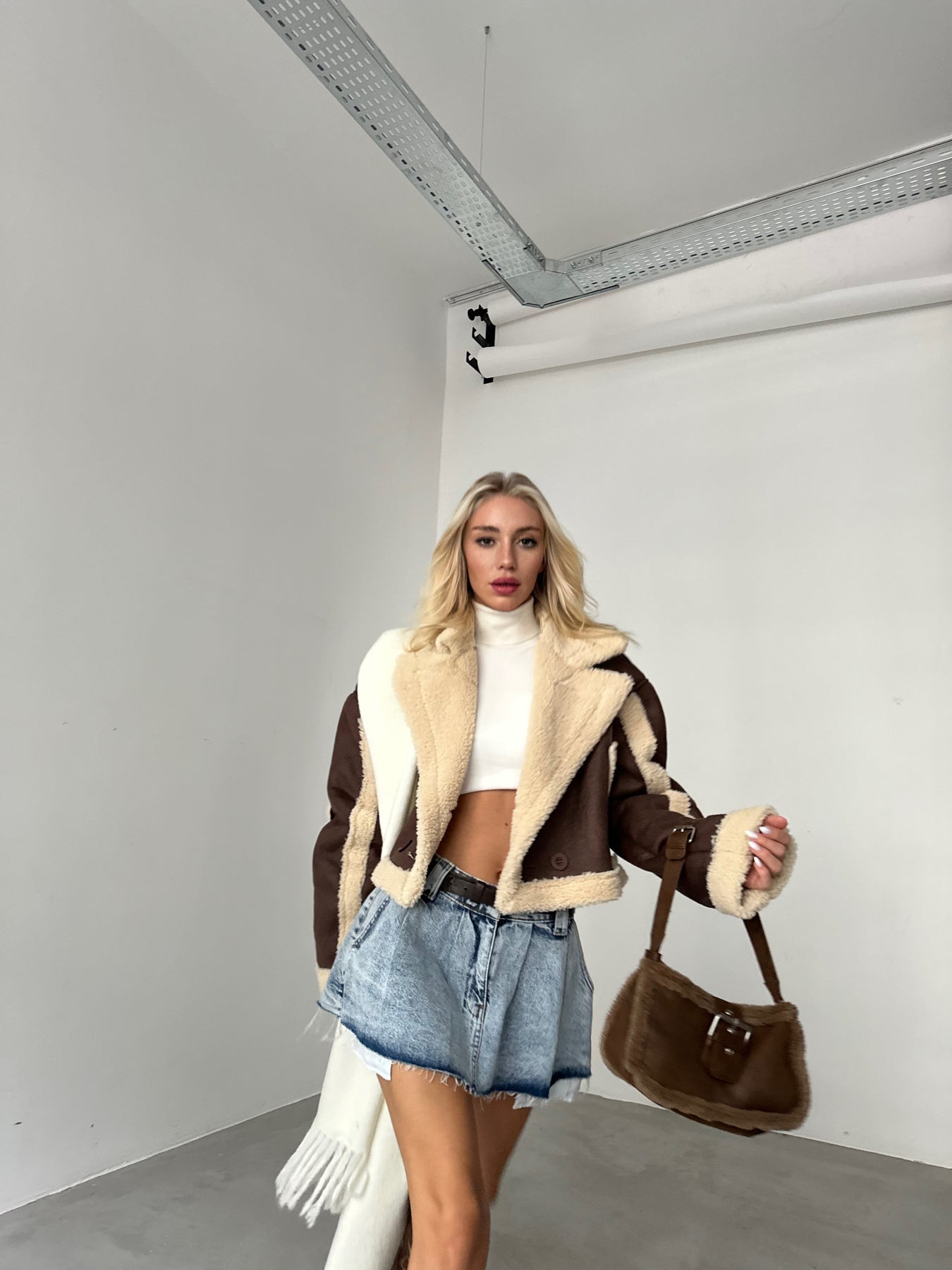 İçi Kürk Detaylı, Düğmeli, Crop Deri Kaban