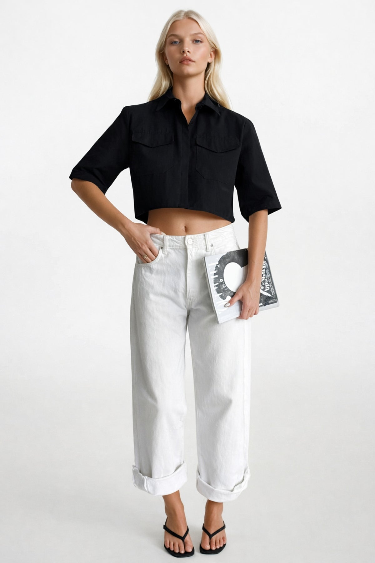 Cep Detay Yarım Kol Crop Keten Siyah Gömlek