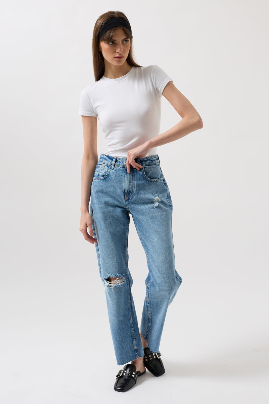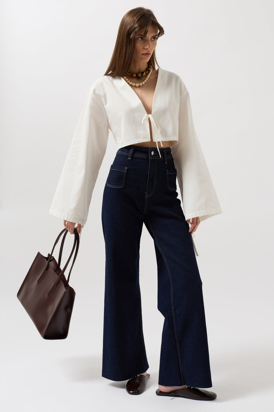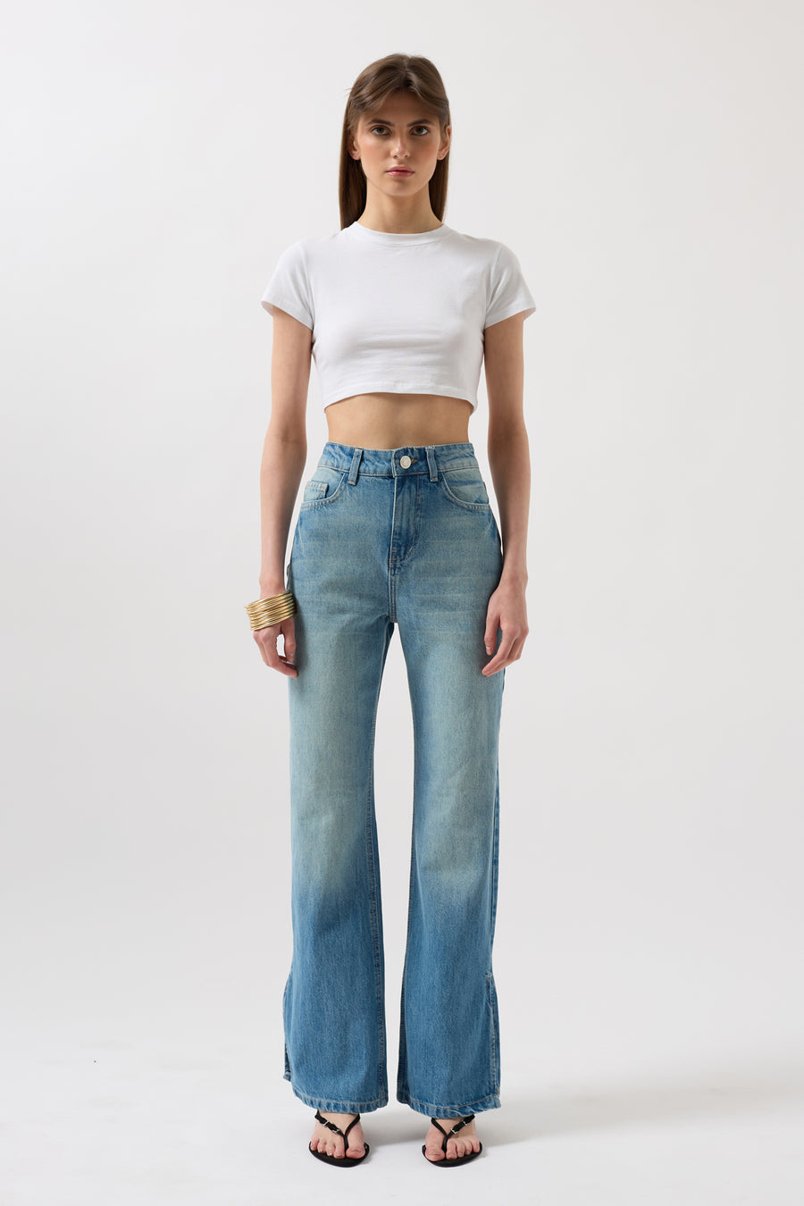 Wide leg jeanler geniş paça kesimiyle hem rahat hem şık bir görünüm sağlar. Basic üstler veya crop bluzlarla tamamlanabilir.