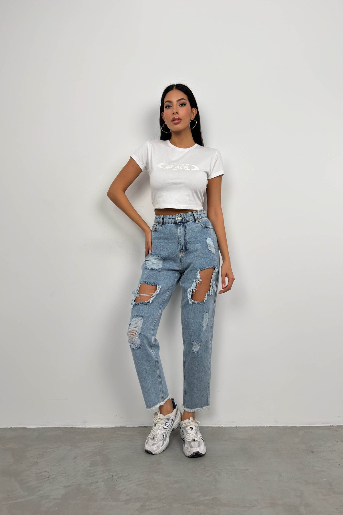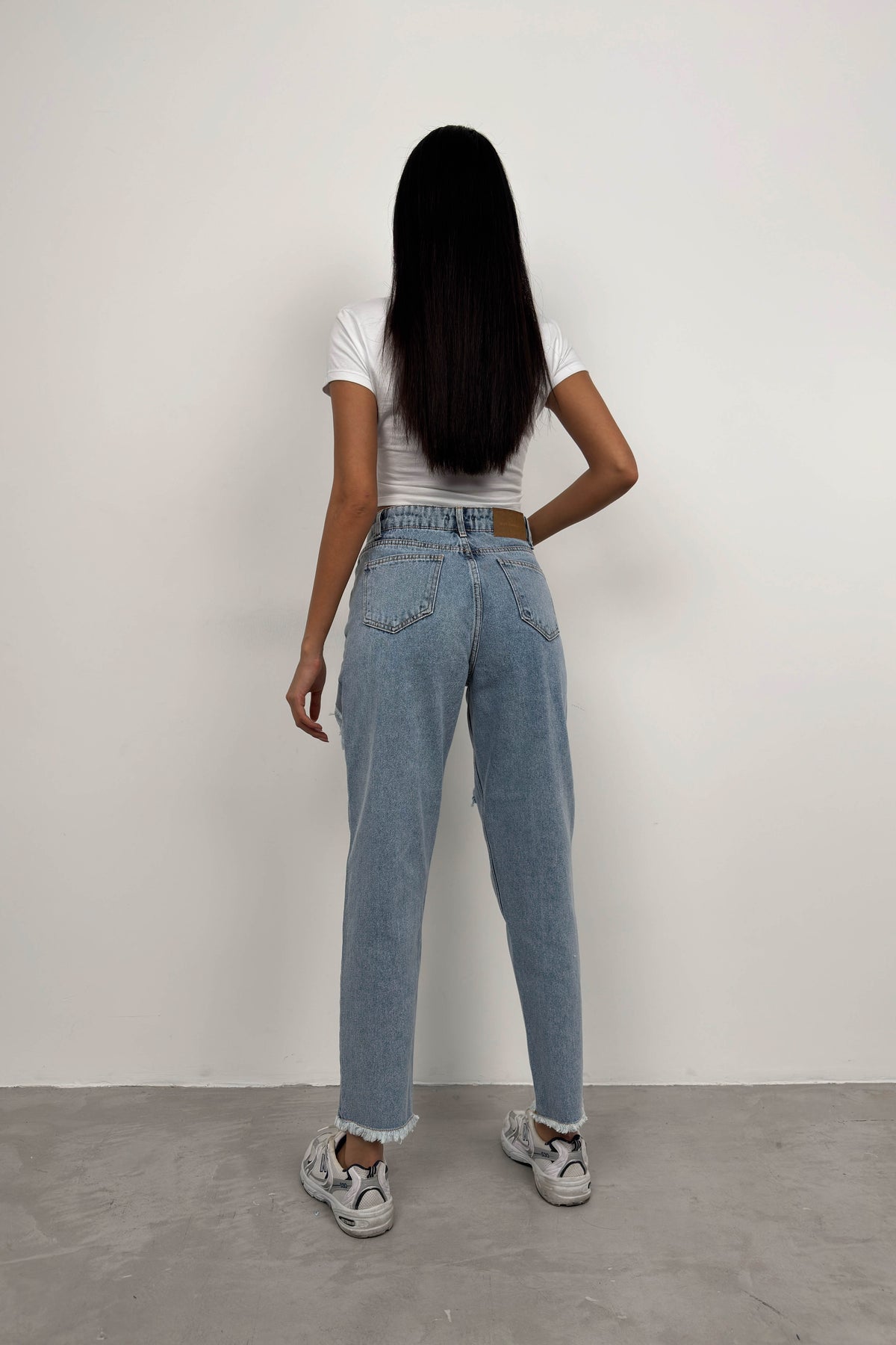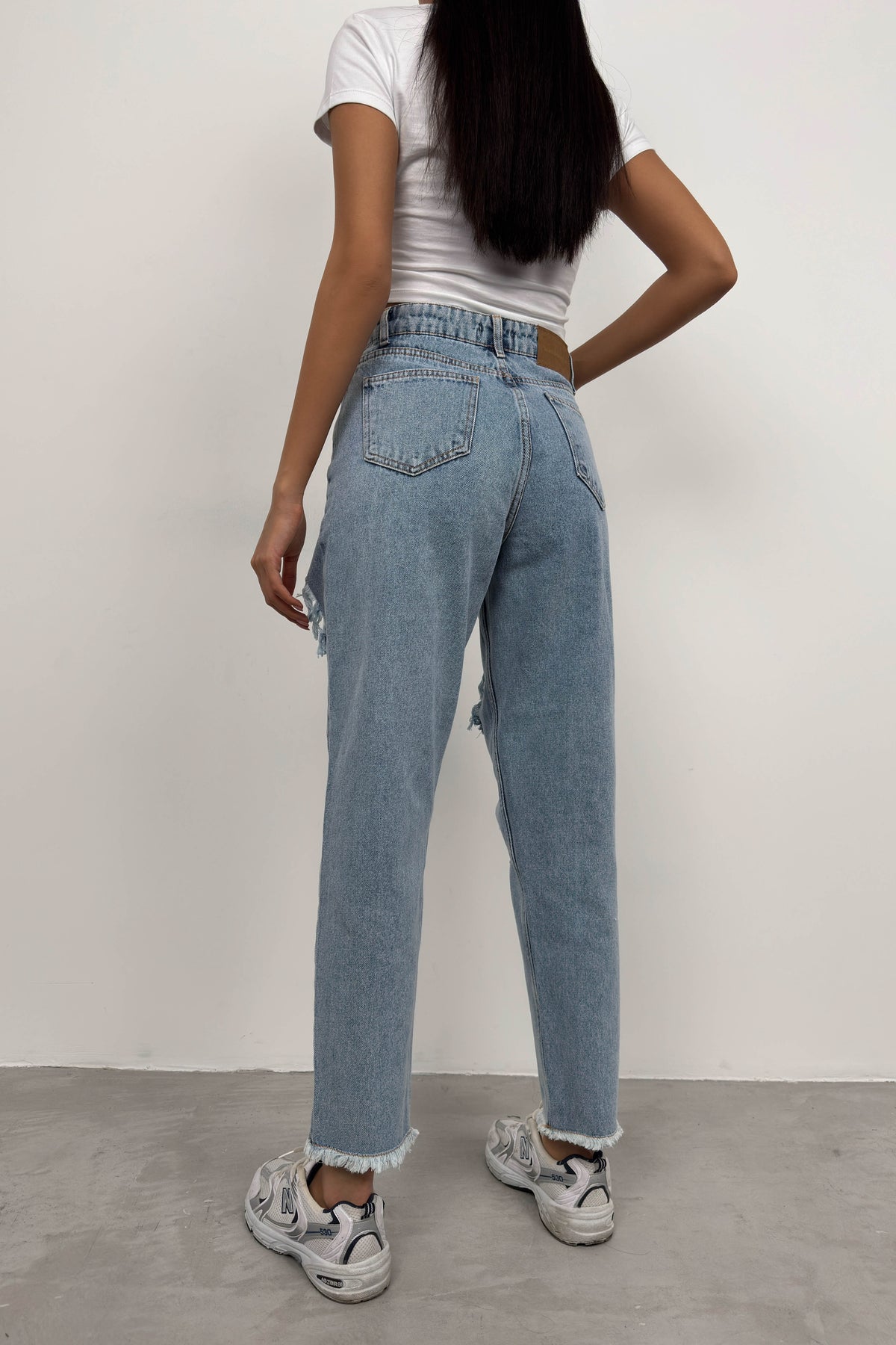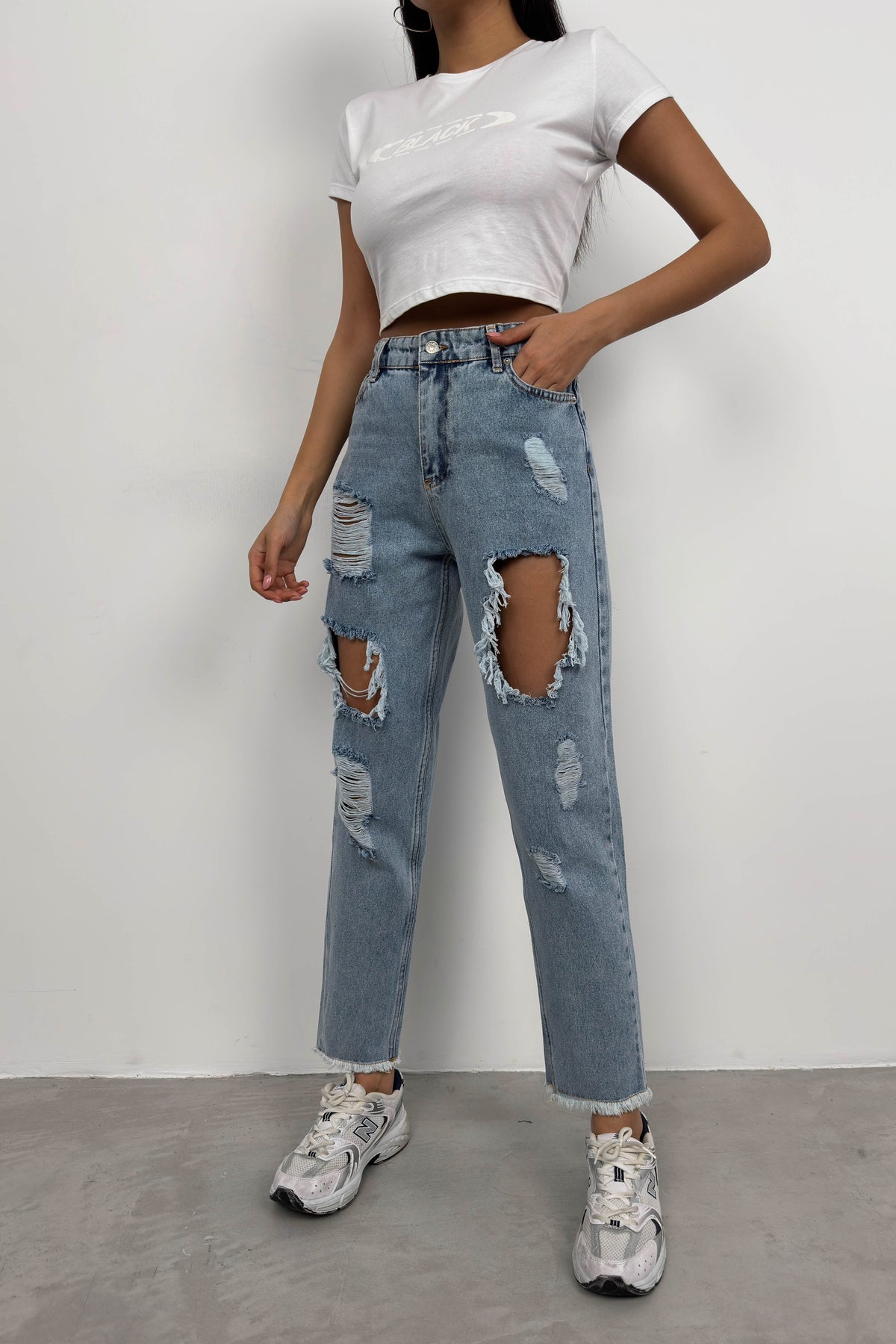 Lazer Kesim, Büyük Yırtıklı, Dört Cepli, Yüksek Bel Jean, Flare Jean, Önü Fermuarlı, Kemerli, Metal Düğmeli.mom jean