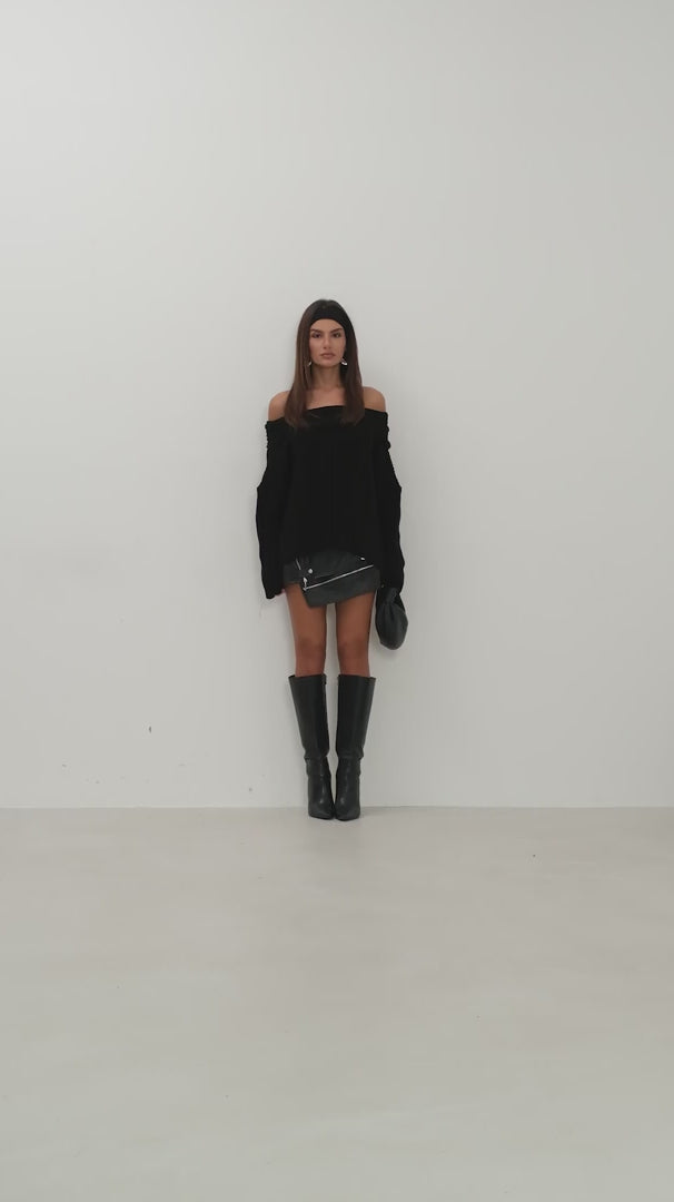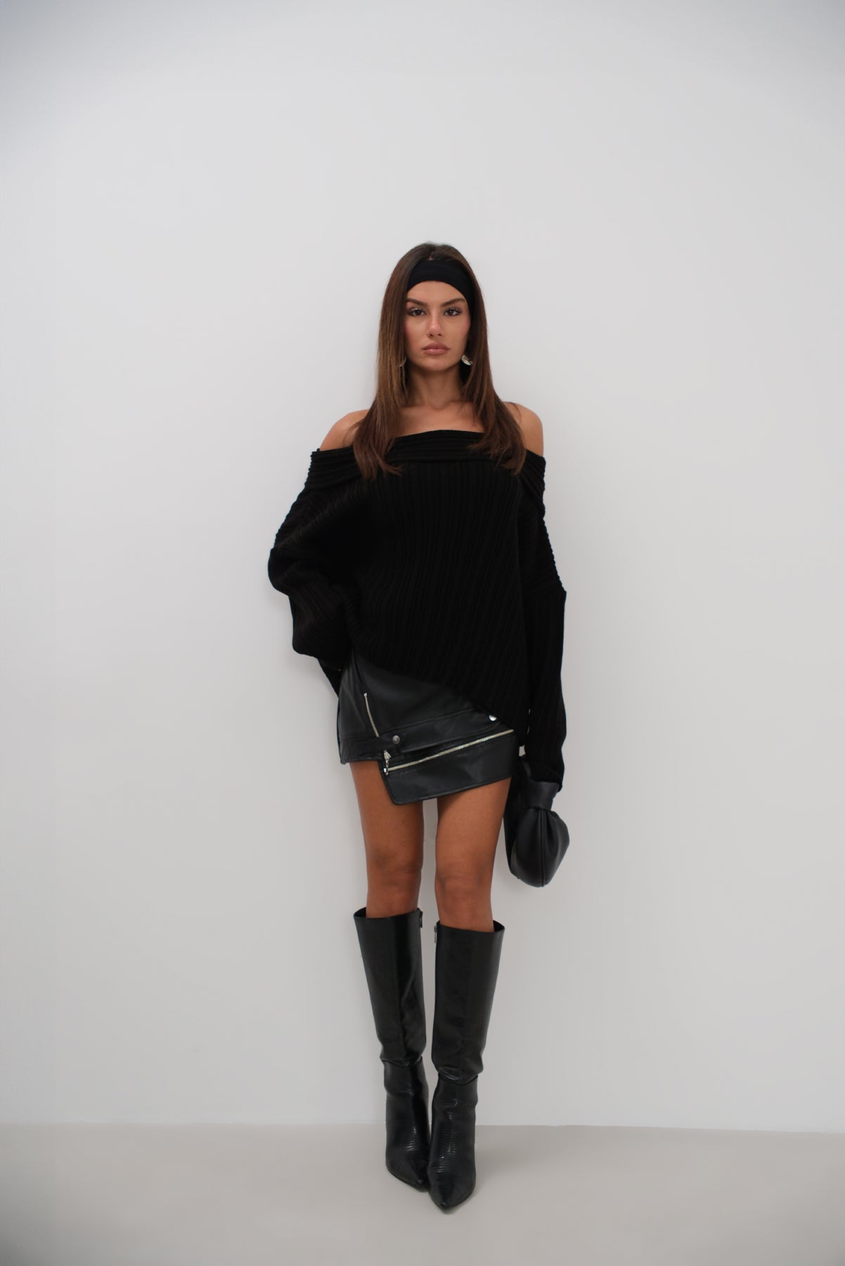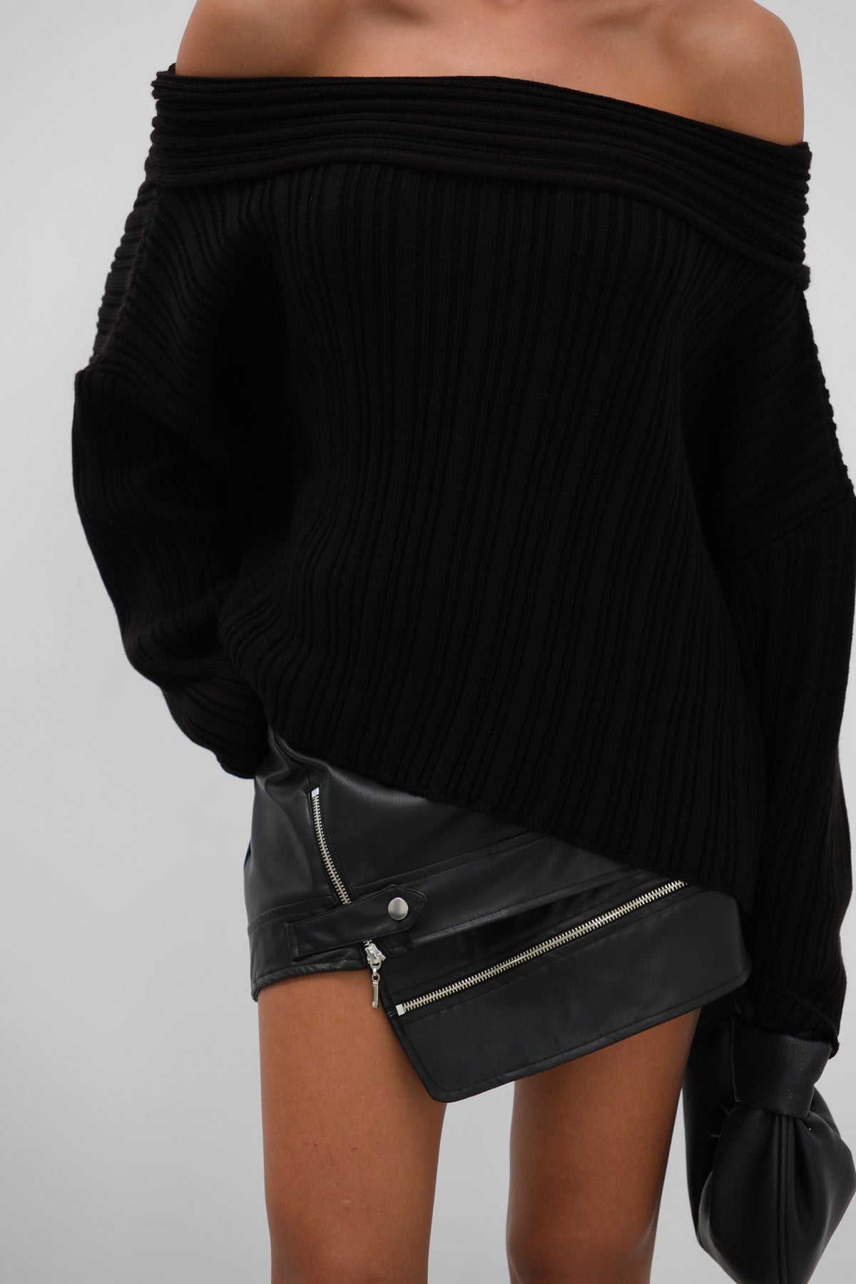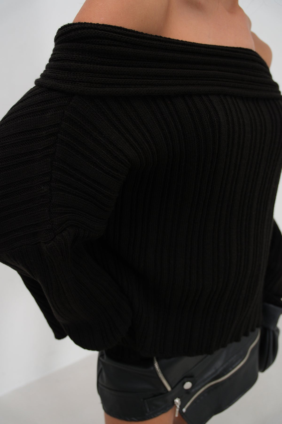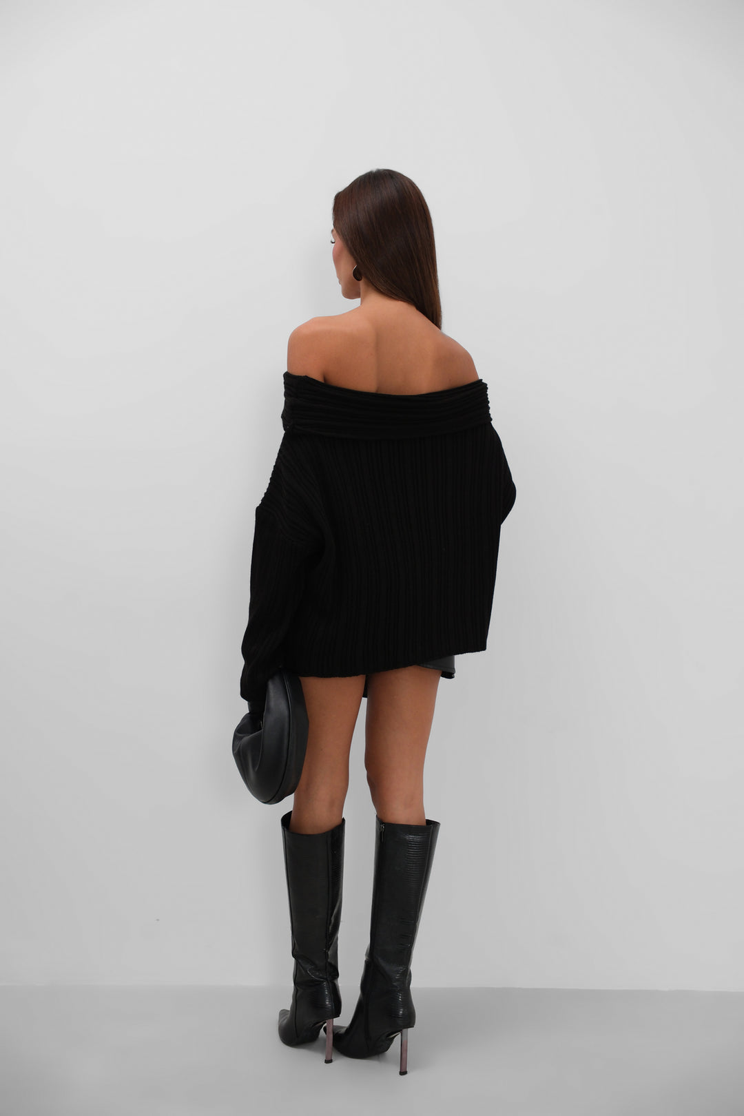 Kayık Yaka Fitilli Triko Siyah Kazak