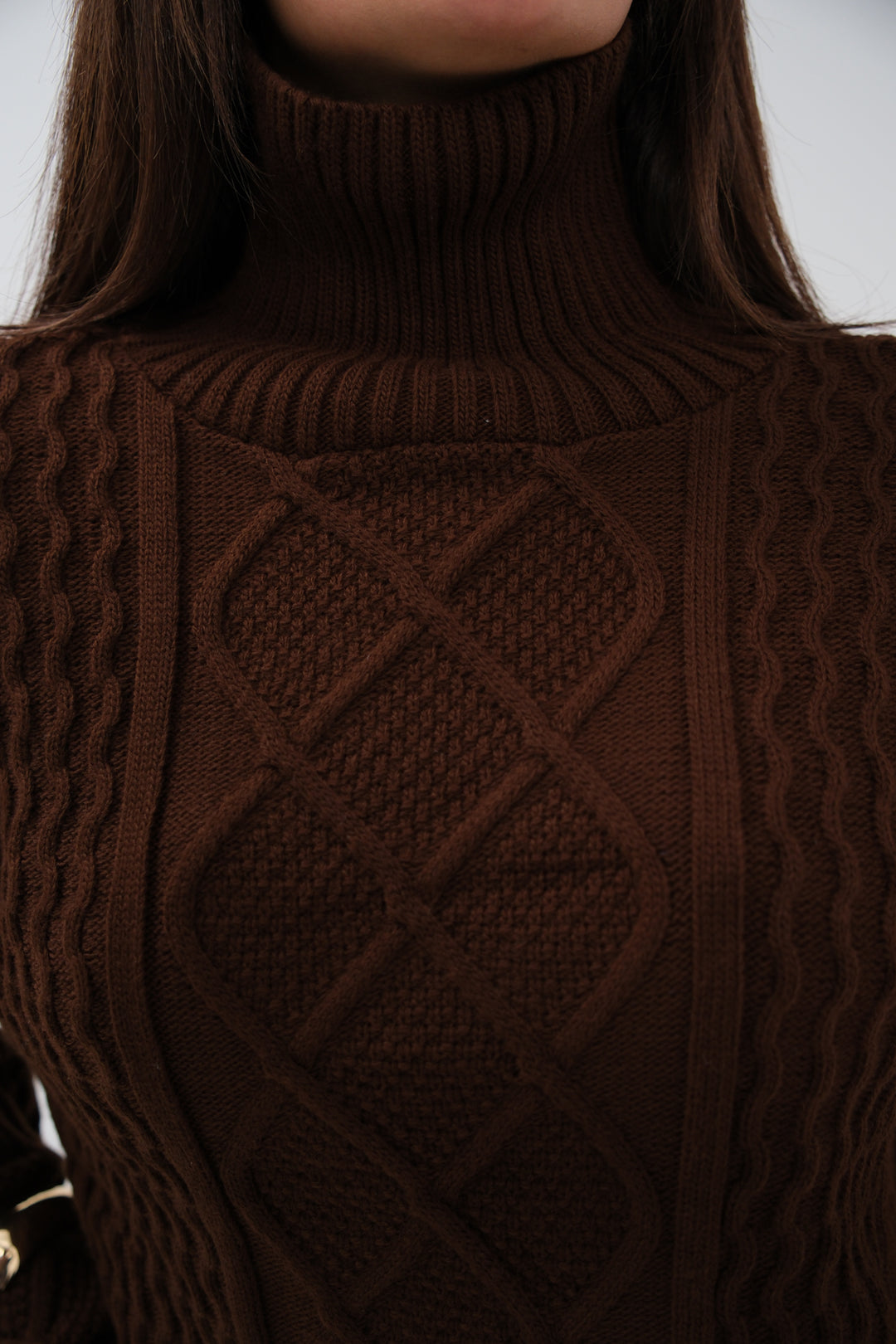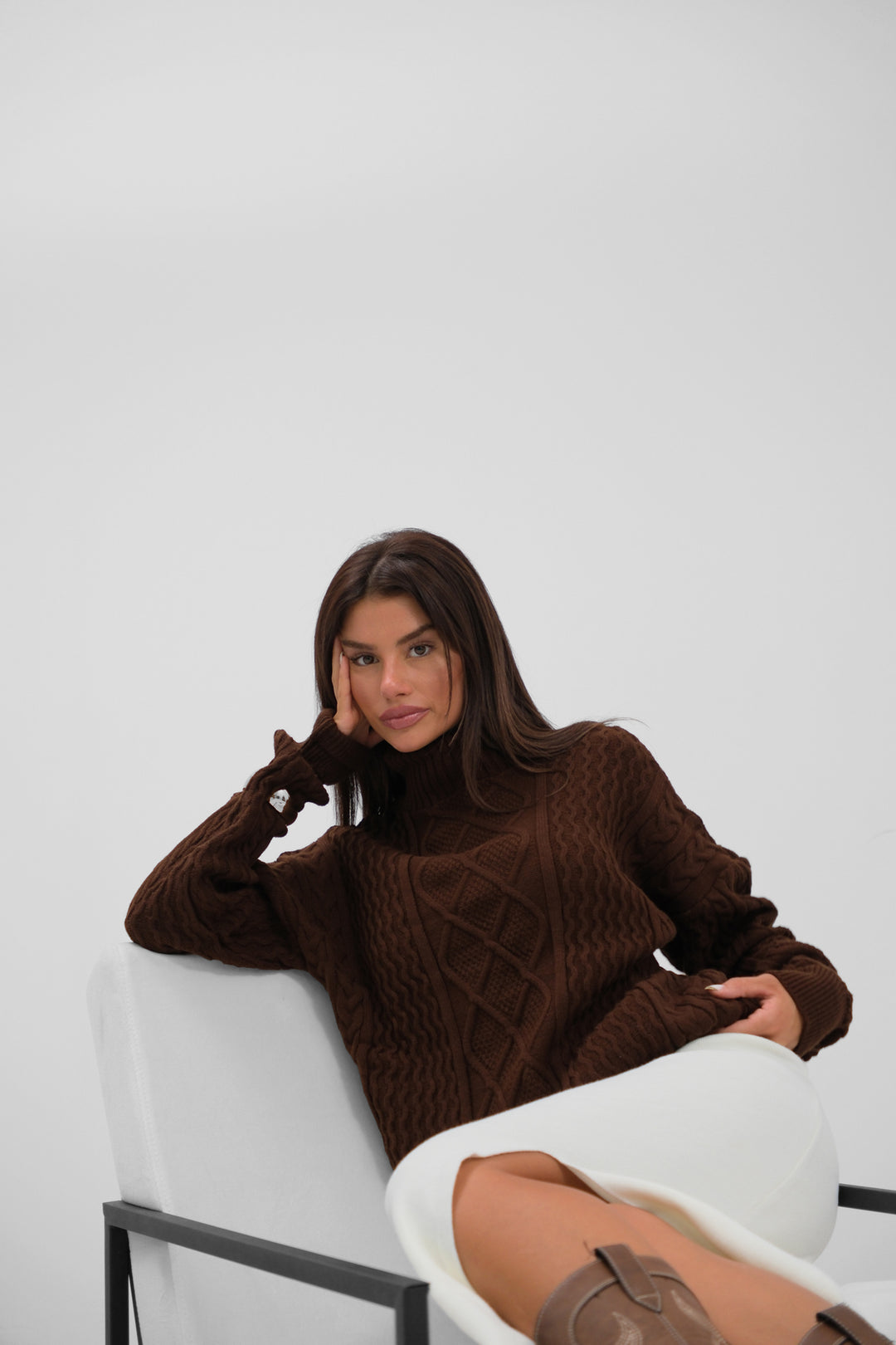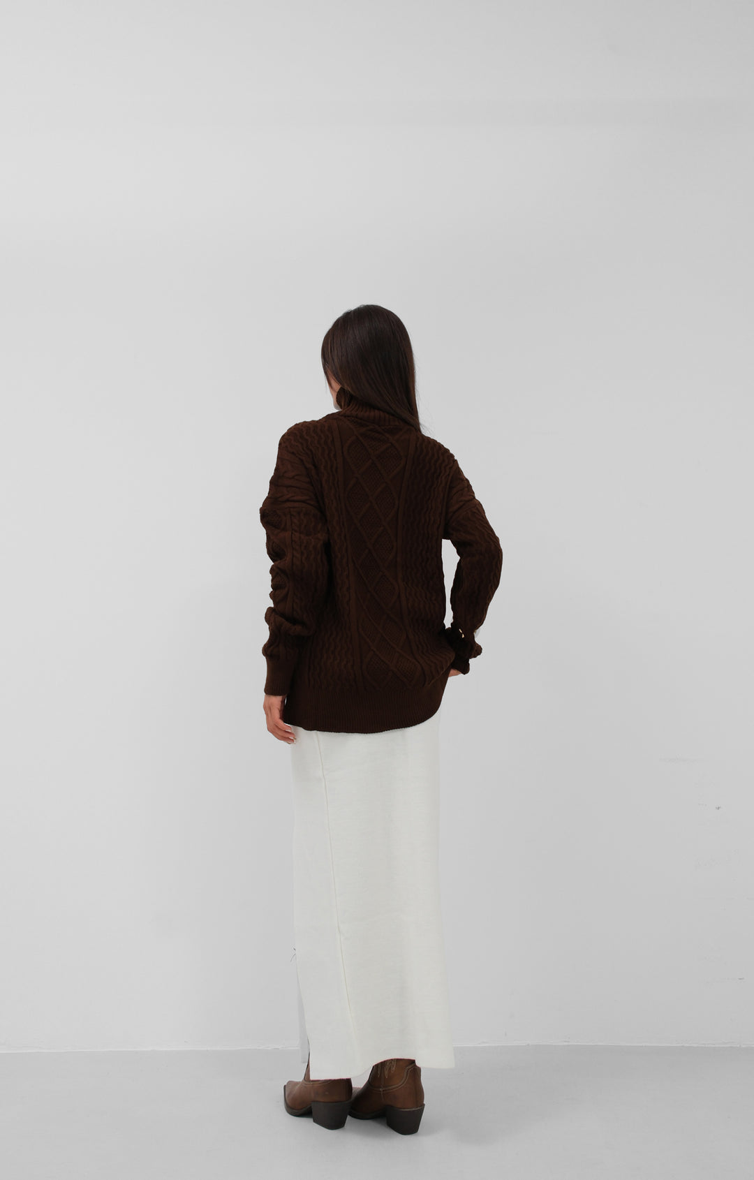 Oversize Boğazlı Kahverengi Örgü Kazak