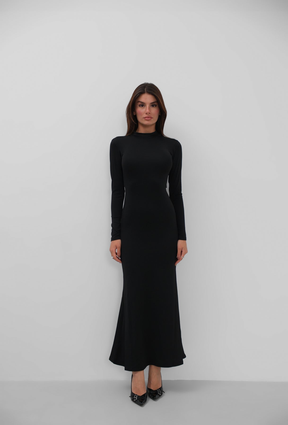 Bel Dekolteli Balıkçı Yaka Maxi Siyah Elbise