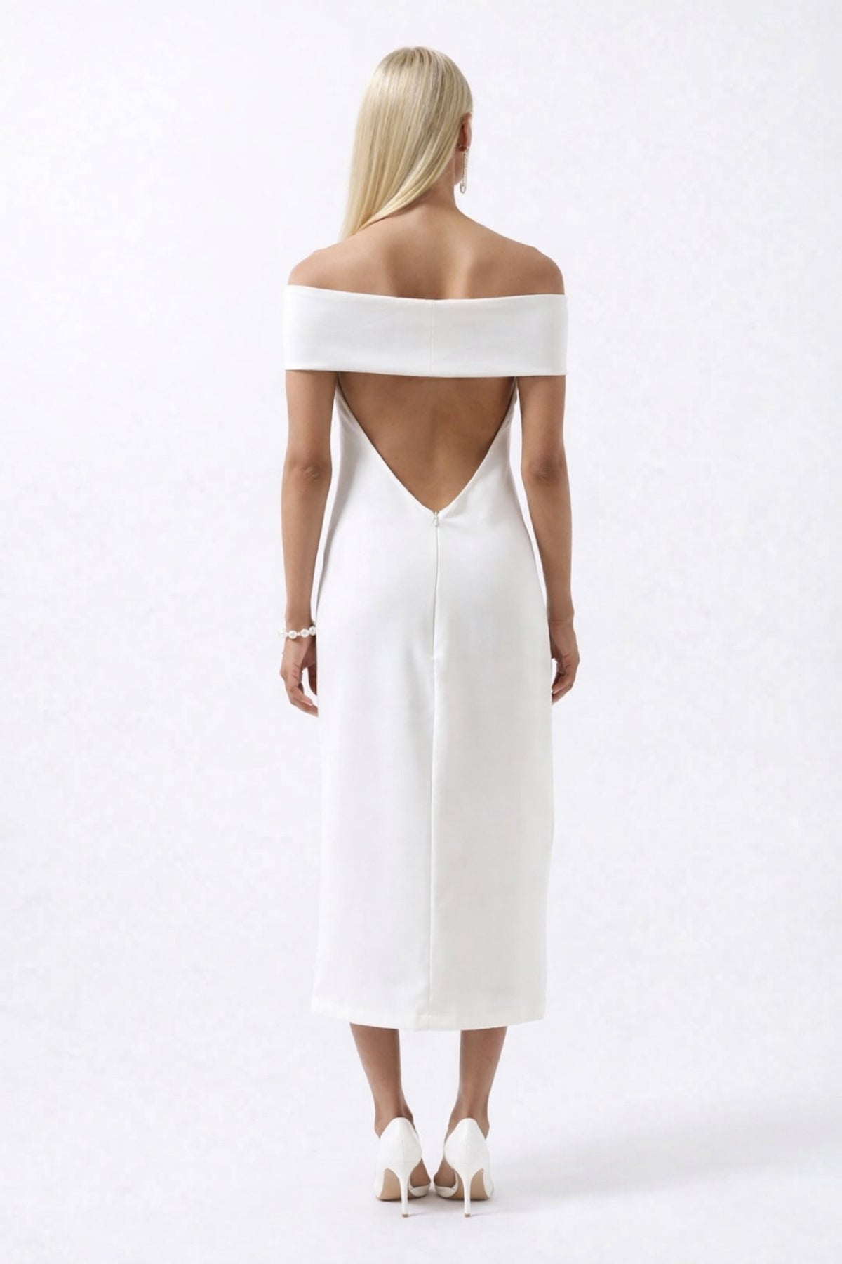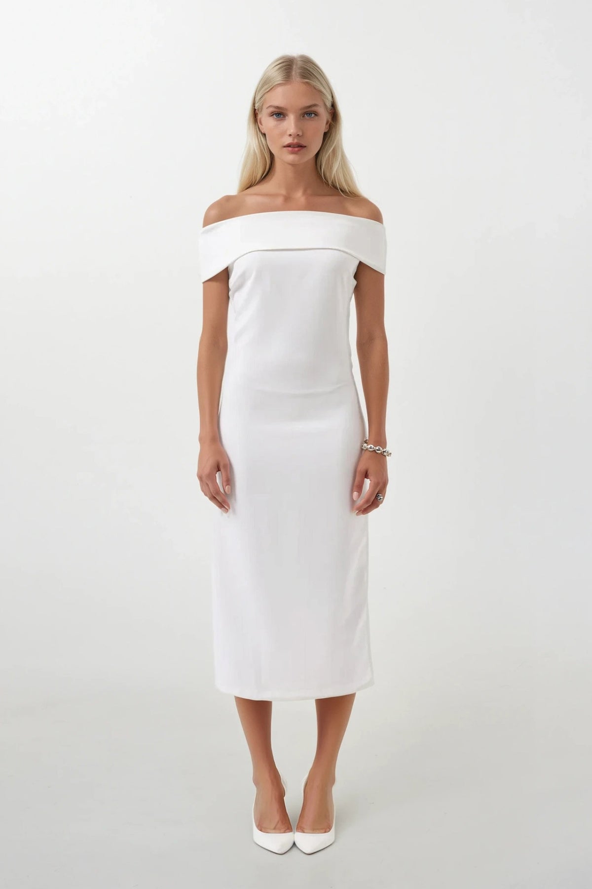 Omuz Katlama Detay Maxi Beyaz Elbise