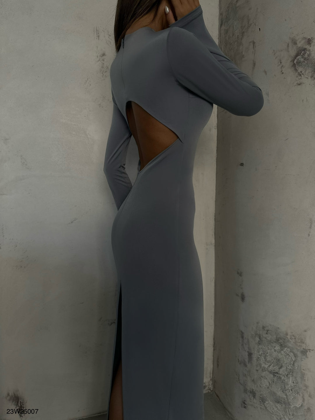 Bisiklet Yaka Gri Maxi Elbise
