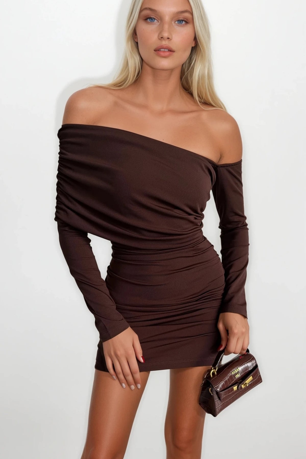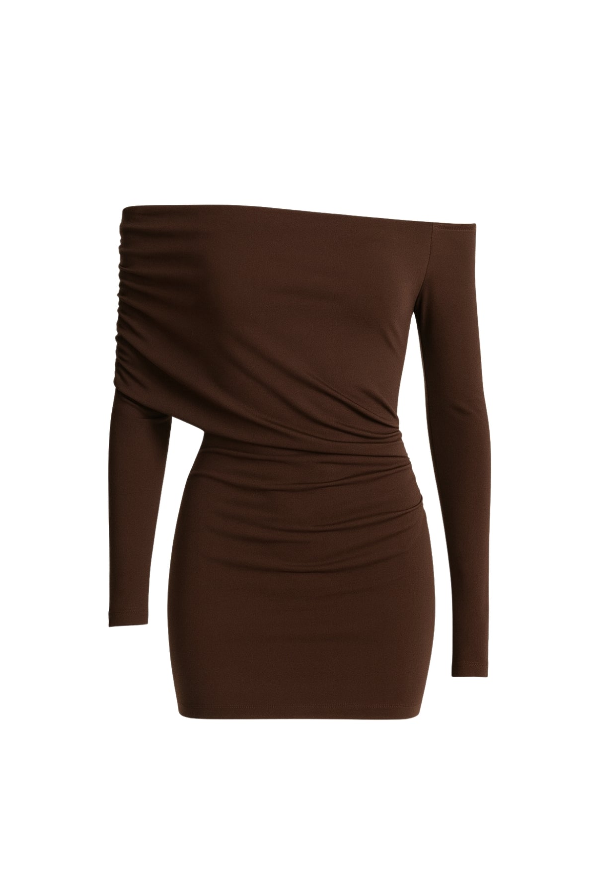 Büzgü Detay Kahverengi Straplez Mini Elbise