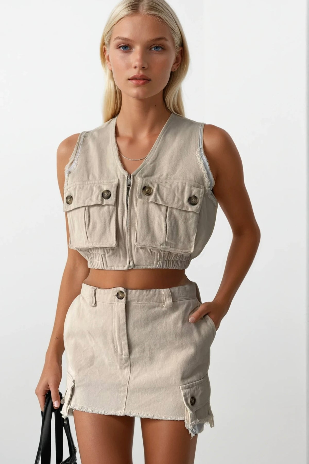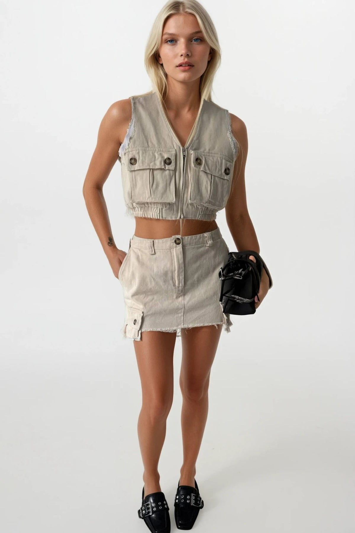 Püsküllenmiş Etek Ucu, Asimetrik Cepli, Düğmeli, Kargo Cepli Mini Etek