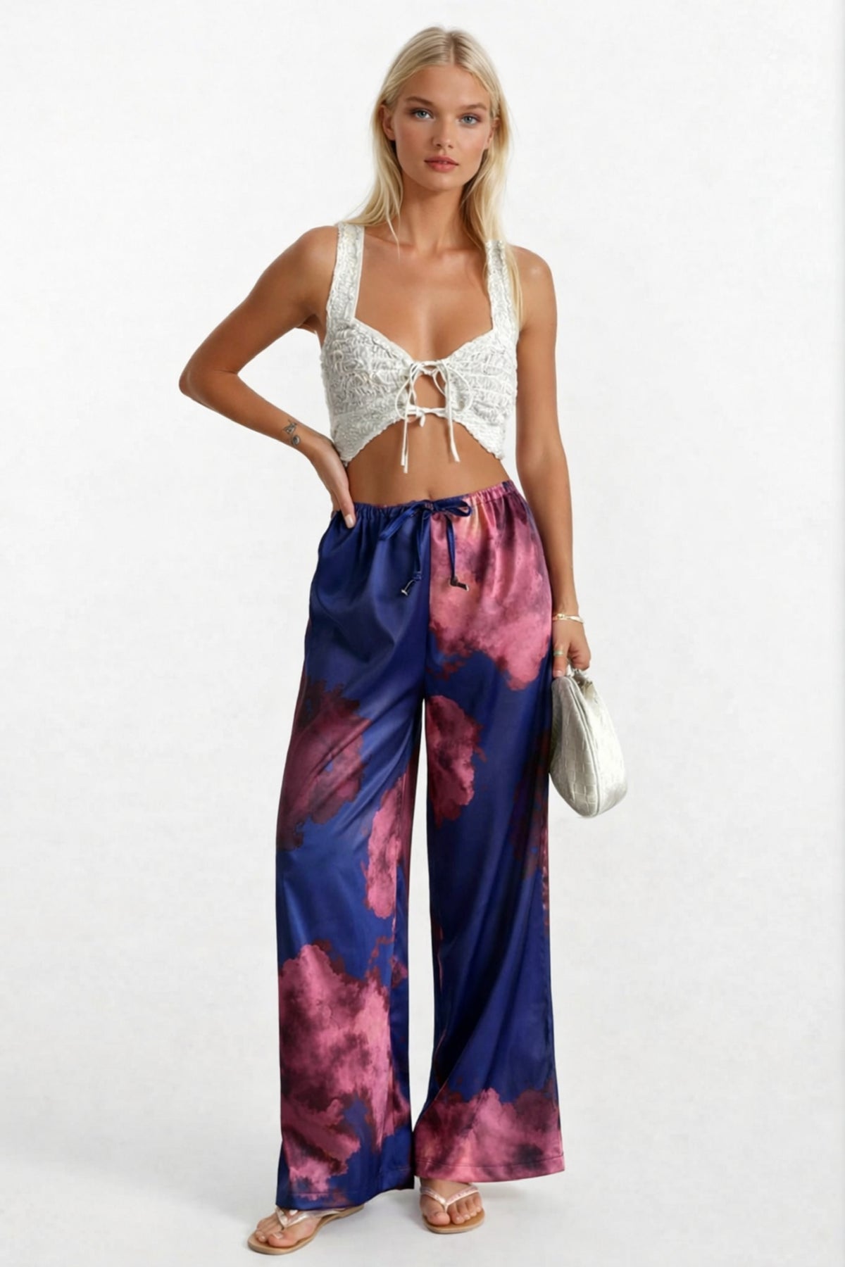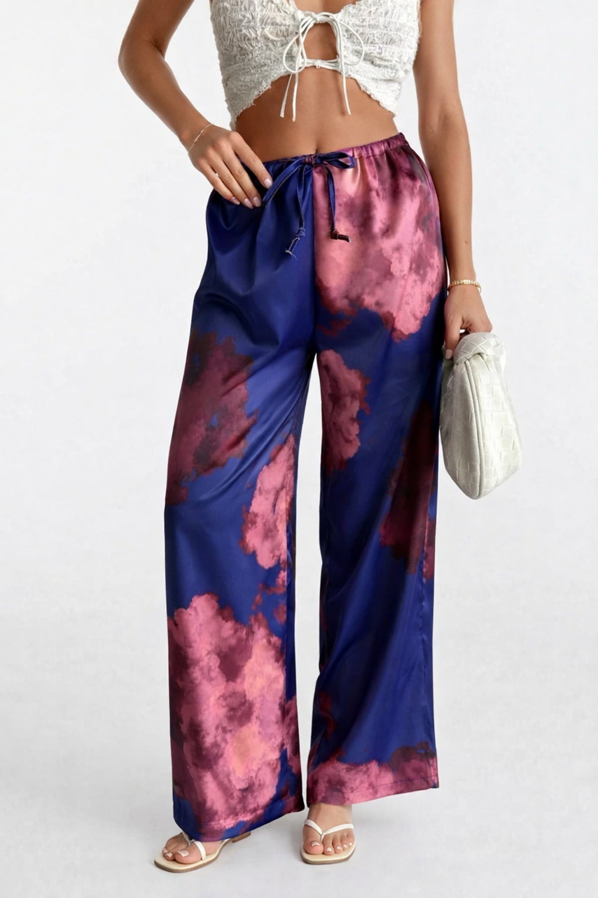 Yumuşak Saten Dokuma, İnce Bel Detaylı, Bağcıklı Bol Paça Pantolon