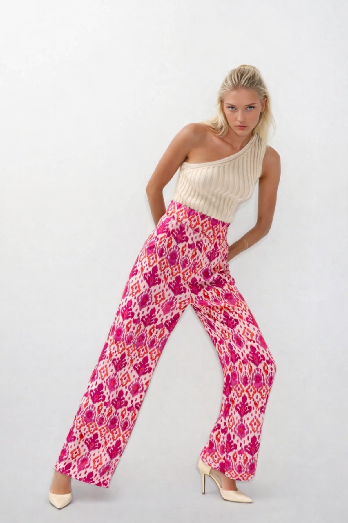 Desenli Saten Pembe Pantolon