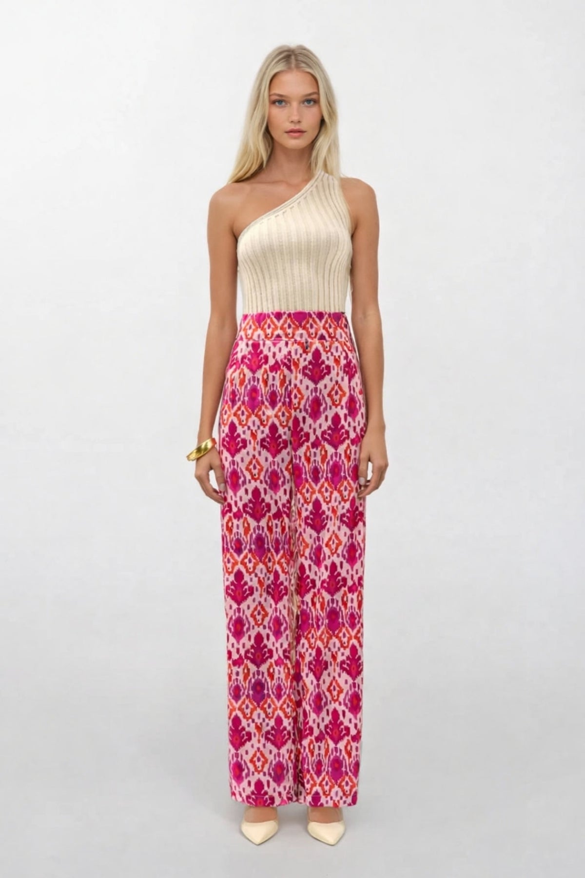 Yüksek Bel, Bol Paça, Geometrik Desenli, Saten Pantolon