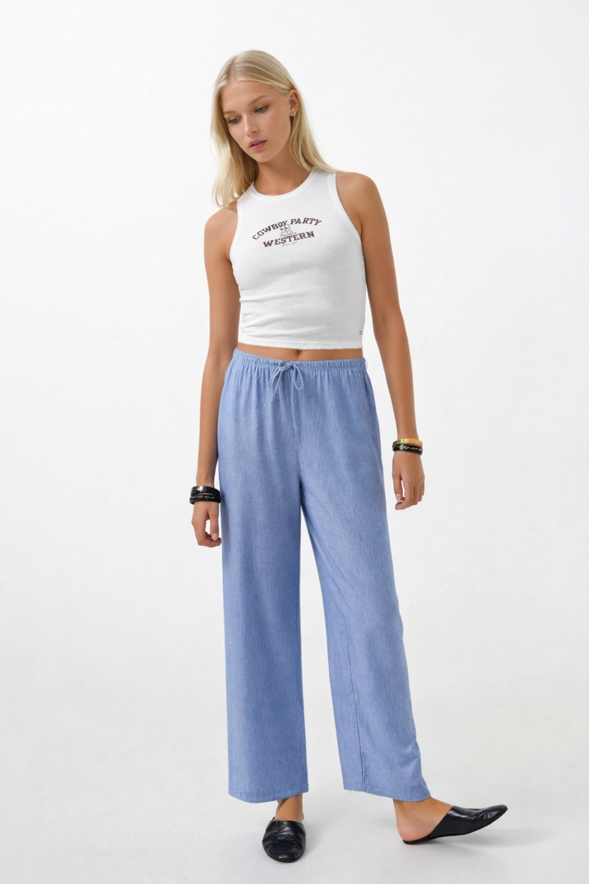 İnce Kemerli Bağcık Detay Açık Mavi Pantolon