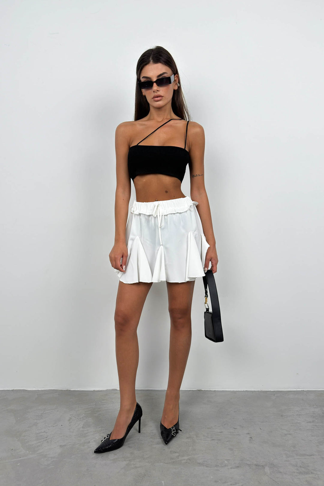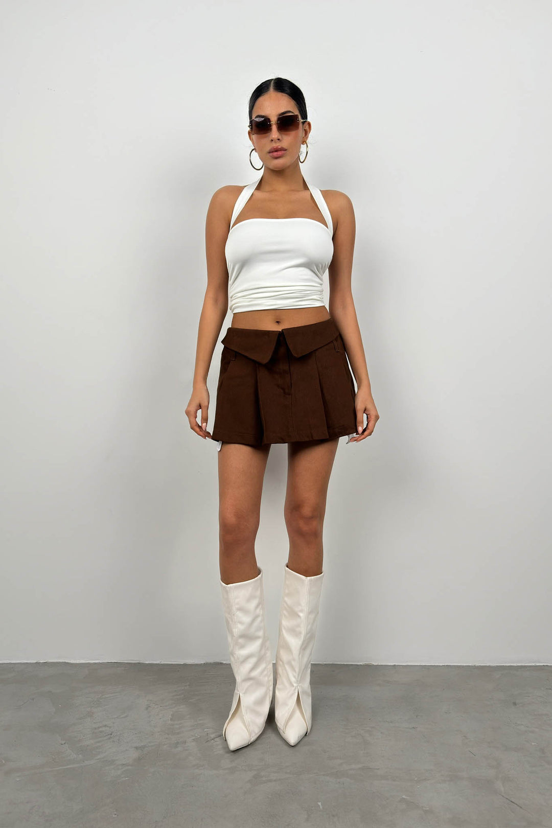 Bel Katlamalı Pileli Kahverengi Mini Etek