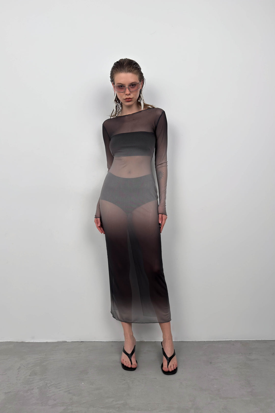 Yırtmaç Detay Baskılı Tül Siyah Elbise