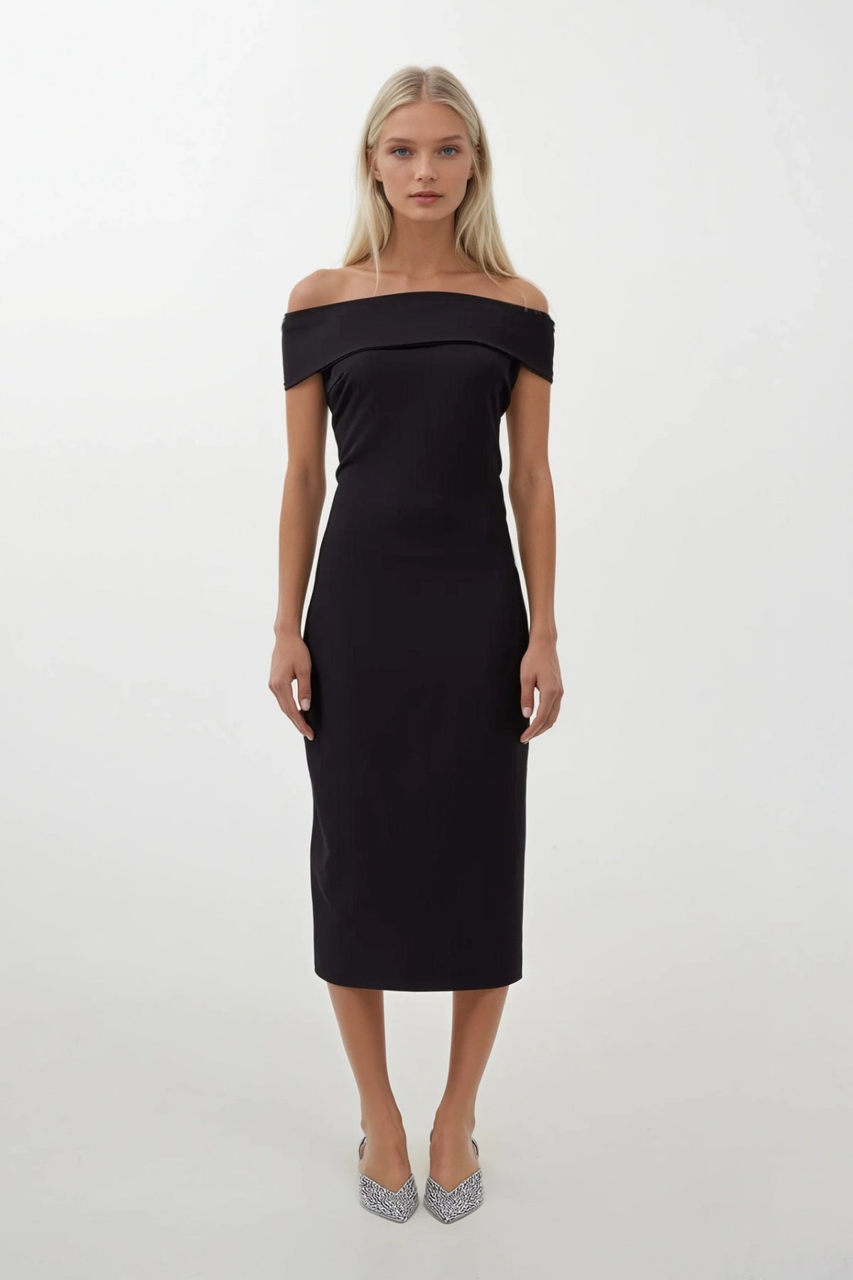 Omuz Katlama Detay Maxi Siyah Elbise