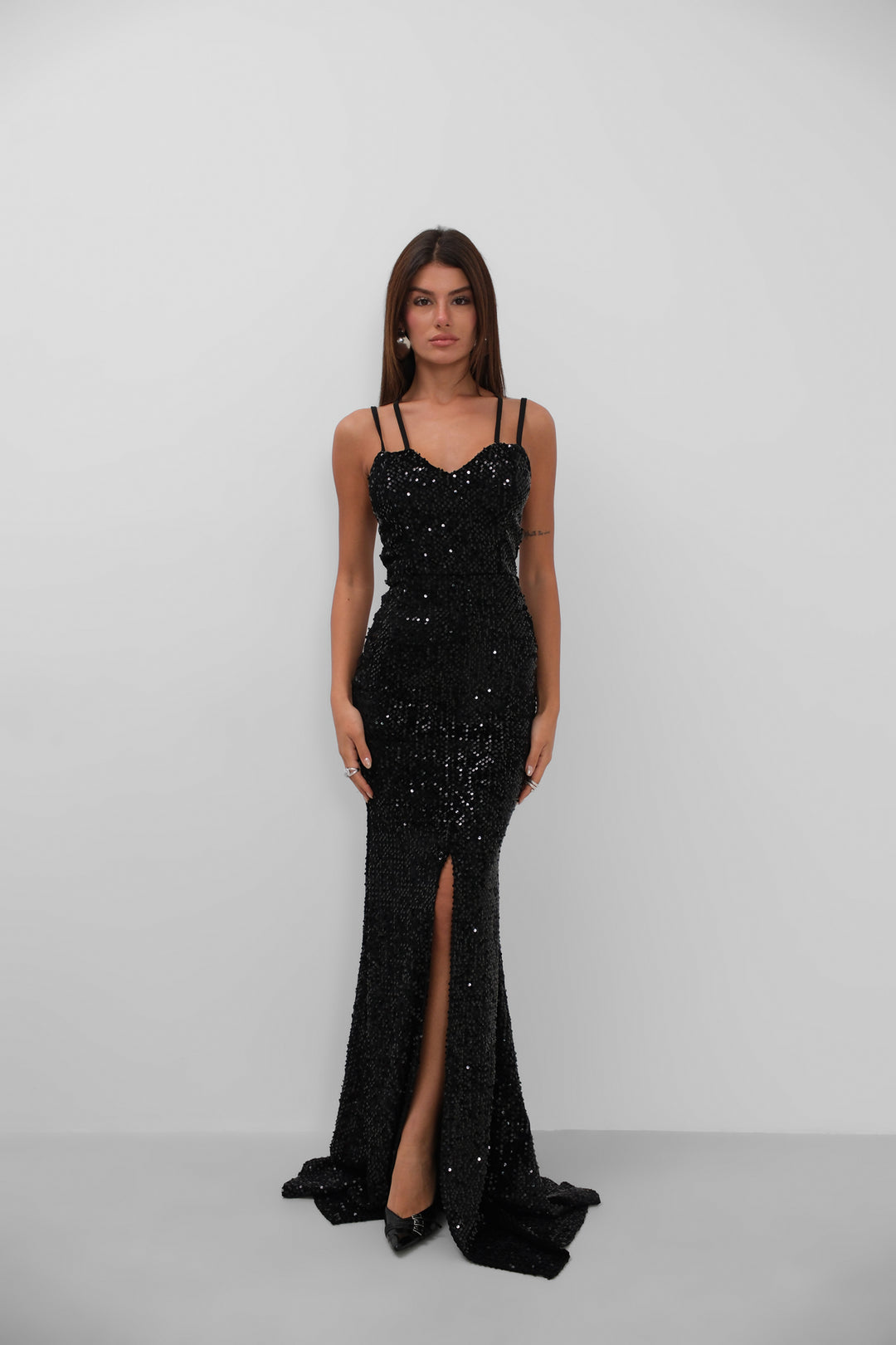 Halka Detay Yarasa Kol Payetli Mini Siyah Elbise