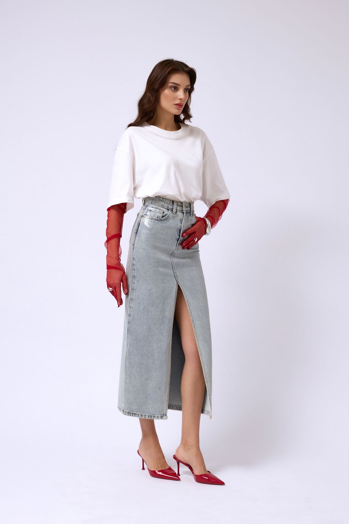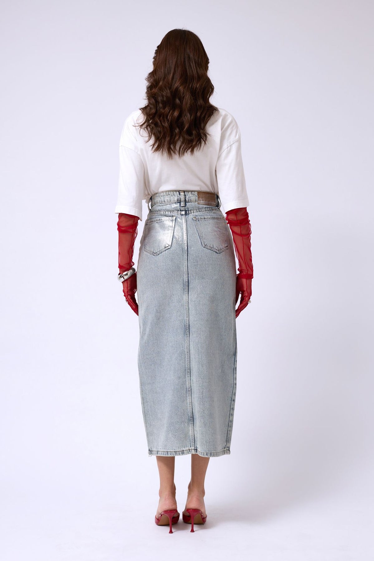 Varak Baskılı Yırtmaçlı Mavi Maxi Kot Etek