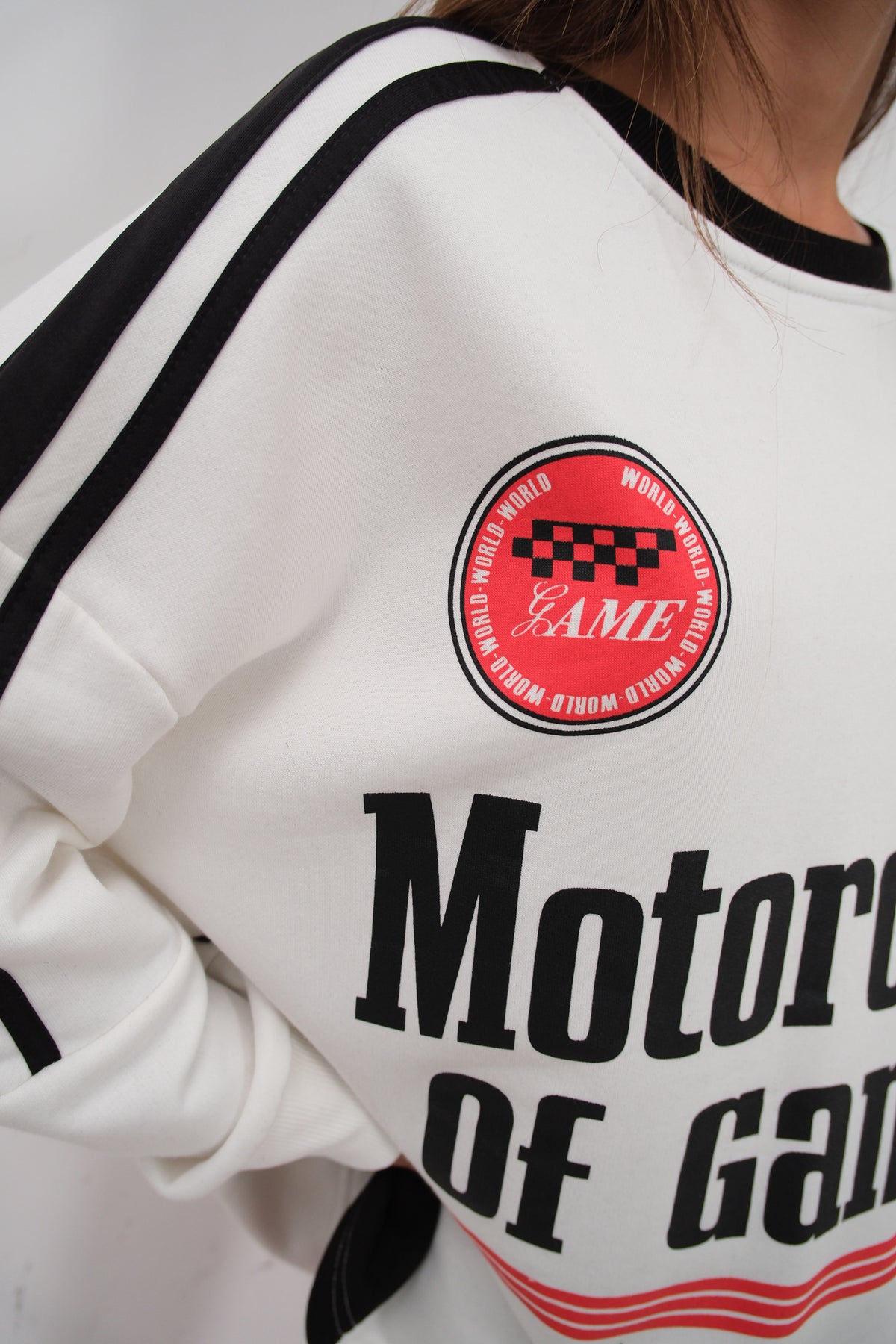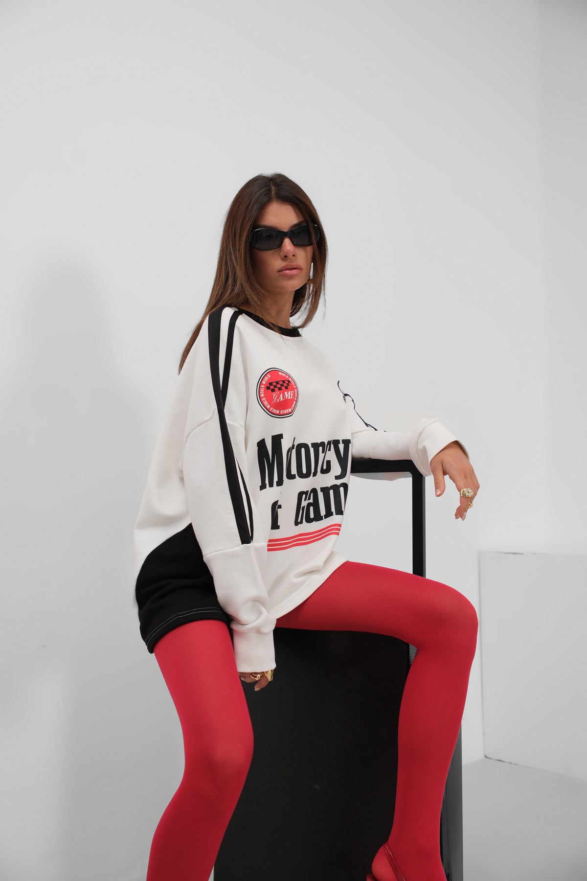 Şerit Detay Baskılı Oversize Ekru Sweatshirt