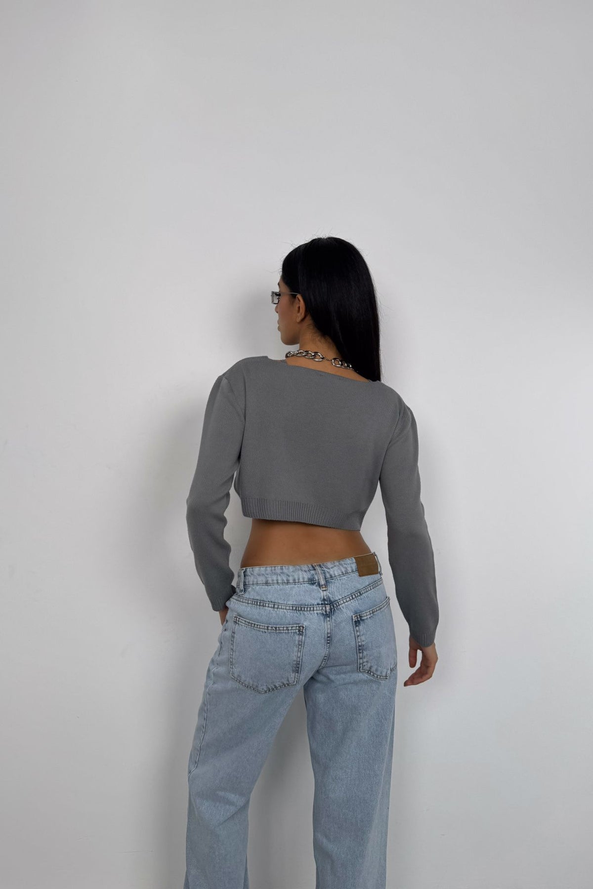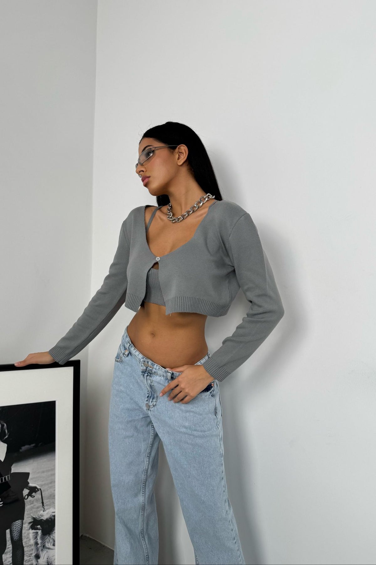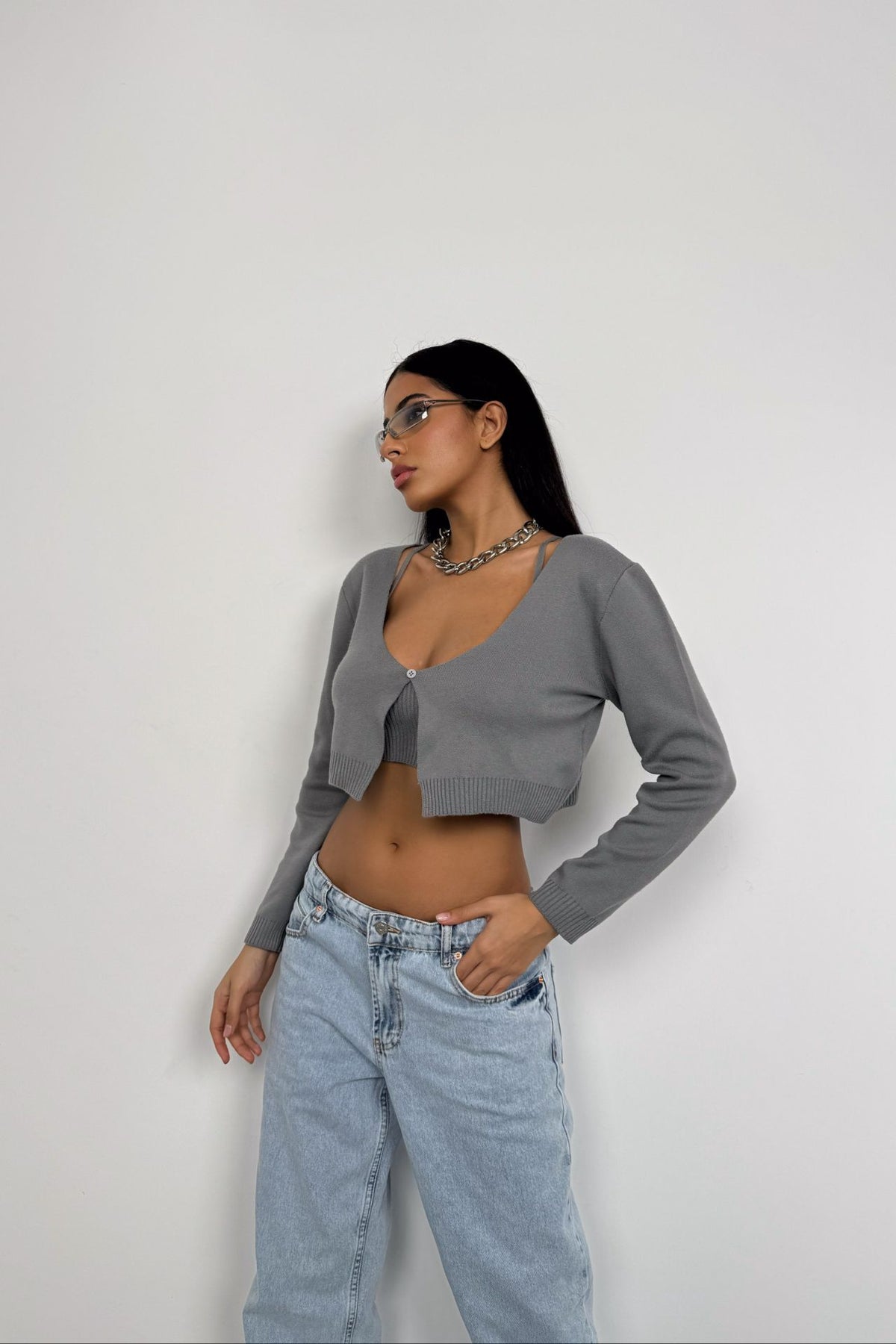 Askılı Bluz Hırka Gri Triko Takım