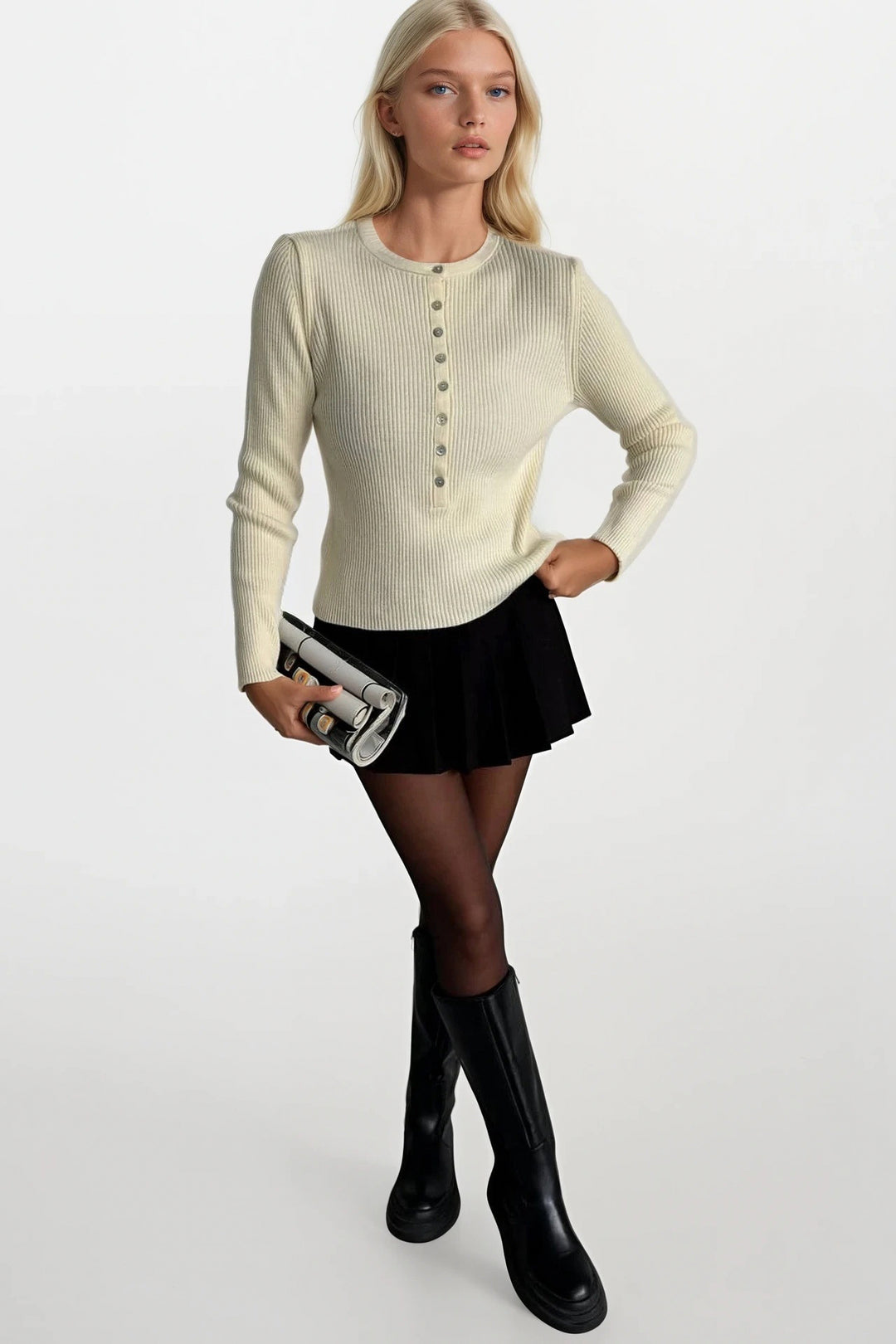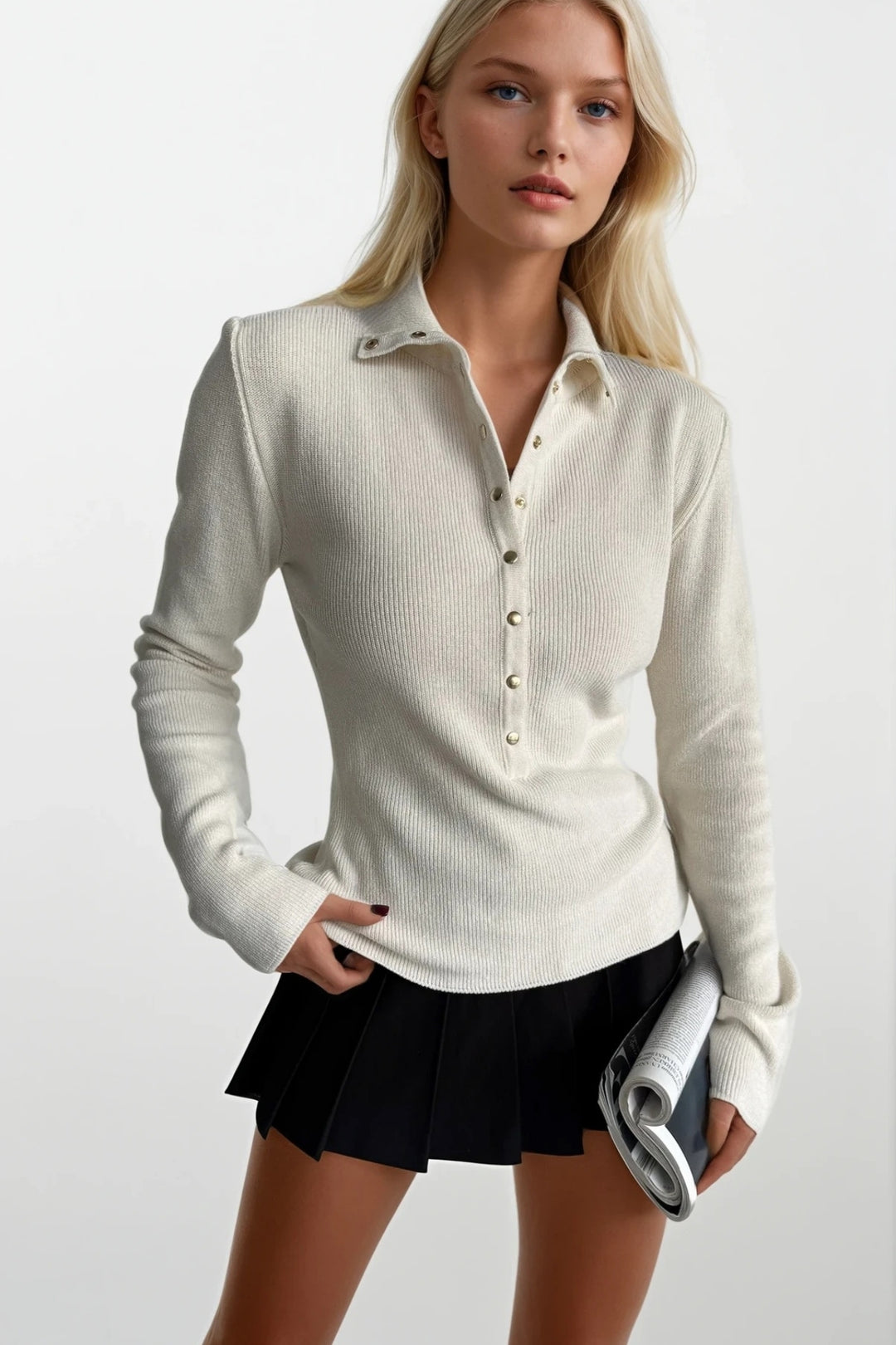 Balıkçı Yaka Çıtçıtlı Ekru Triko Bluz