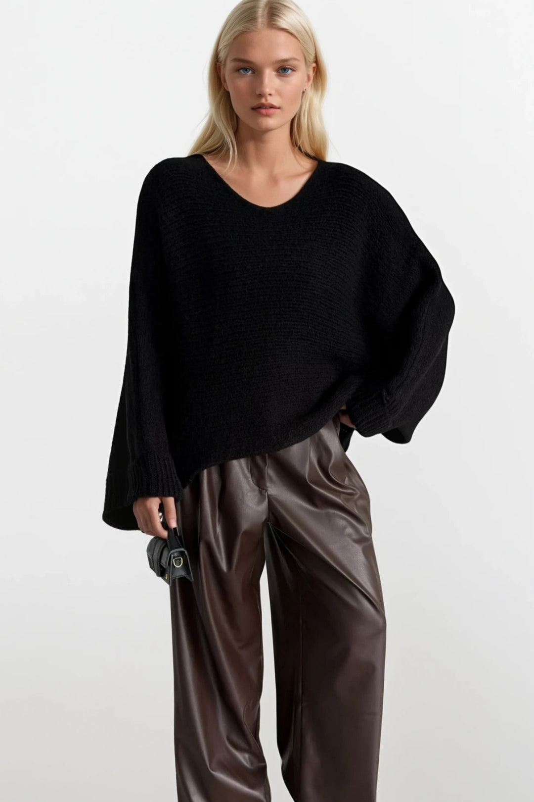 Kayık Yaka Kol Katlamalı Siyah Triko Kazak