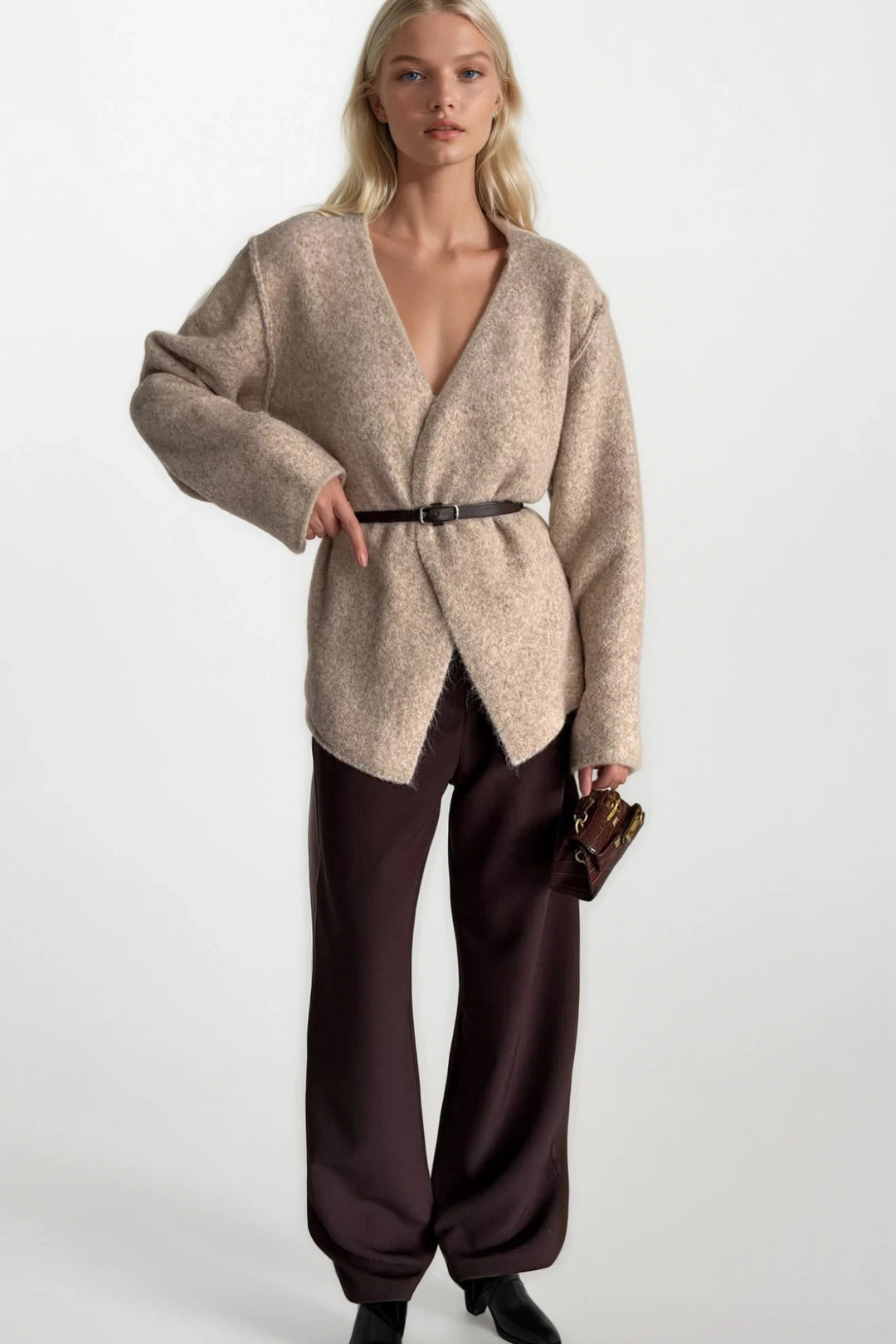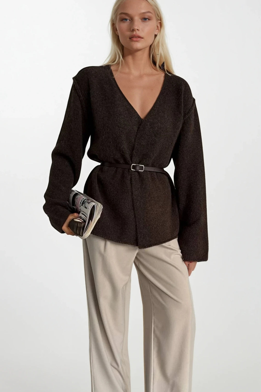 Kemer Detay Kruvaze Yaka Kahverengi Triko Hırka