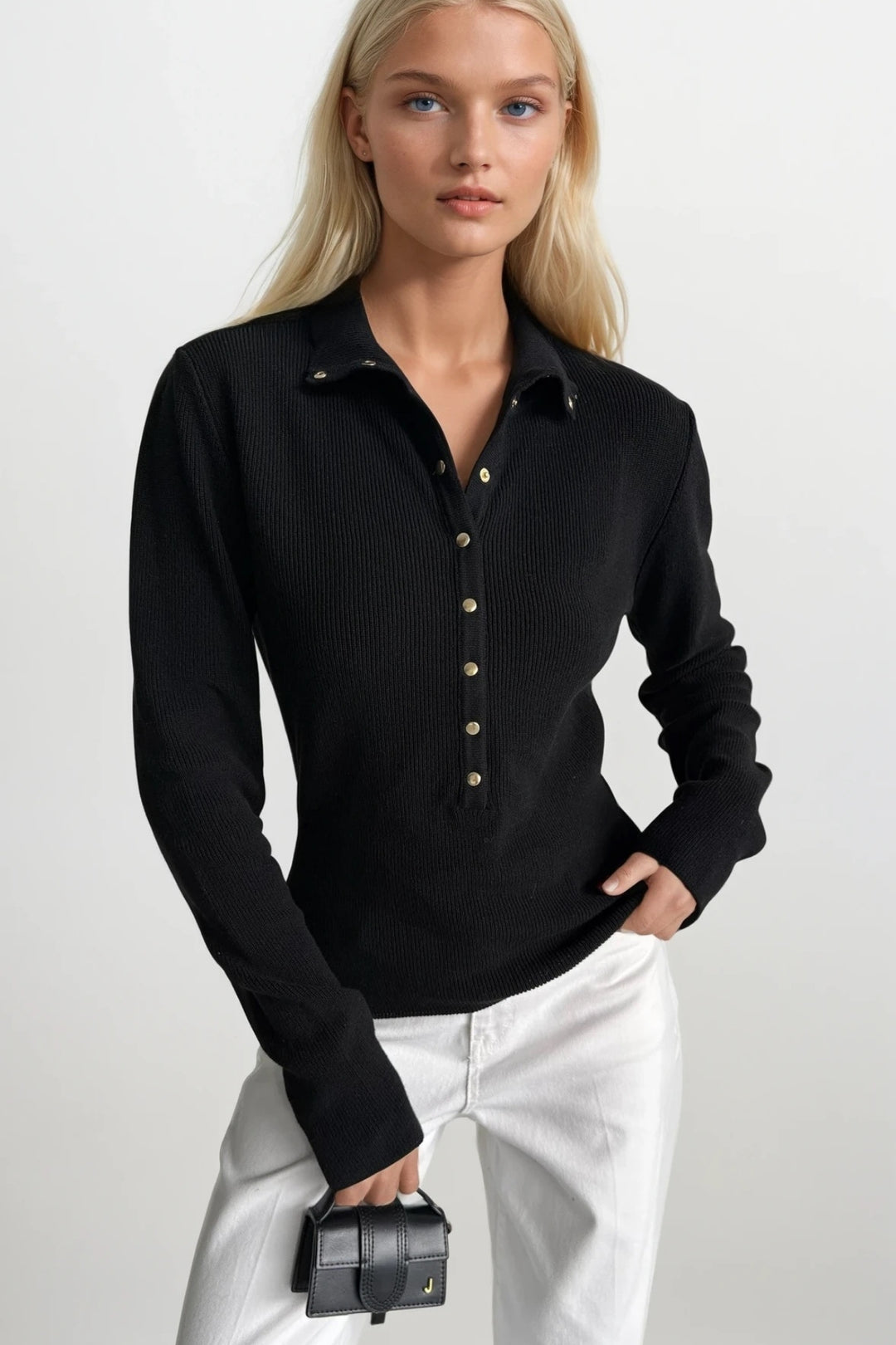 Balıkçı Yaka Çıtçıtlı Siyah Triko Bluz