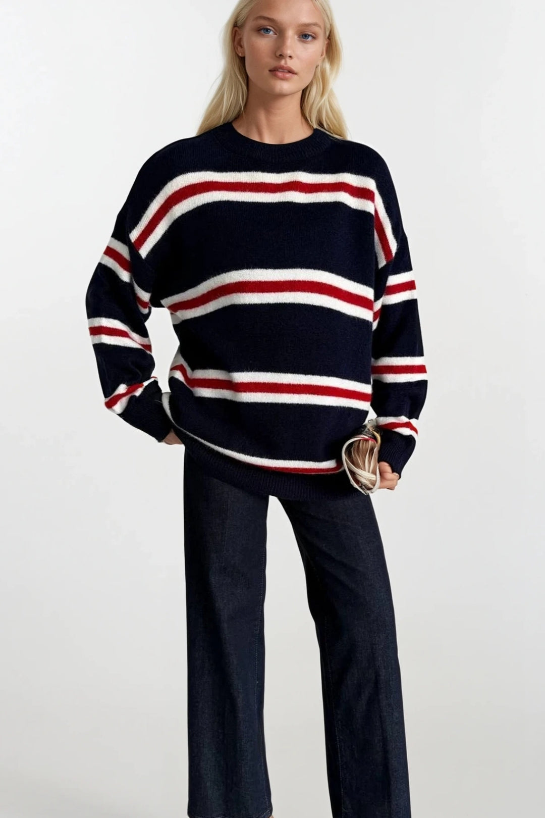 Bisiklet Yaka Çizgili Lacivert Triko Kazak