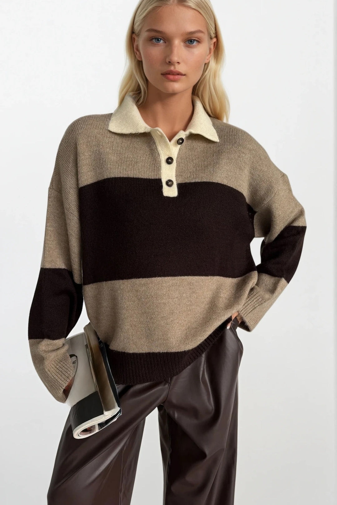 Çizgili Polo Yaka Kahverengi Yumoş Triko Hırka