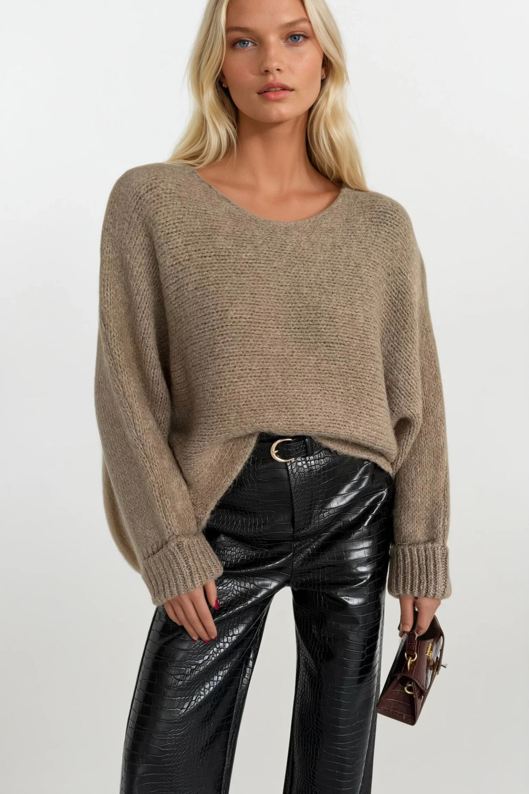 Kayık Yaka Kol Katlamalı Bej Triko Kazak