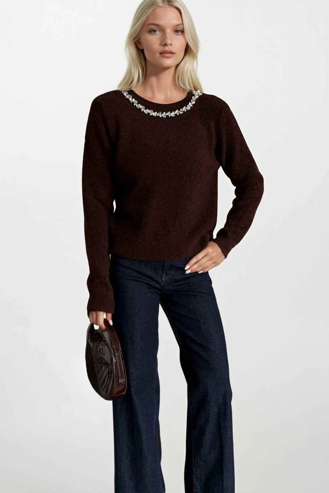 Yaka Taş İşlemeli Kahverengi Triko Kazak