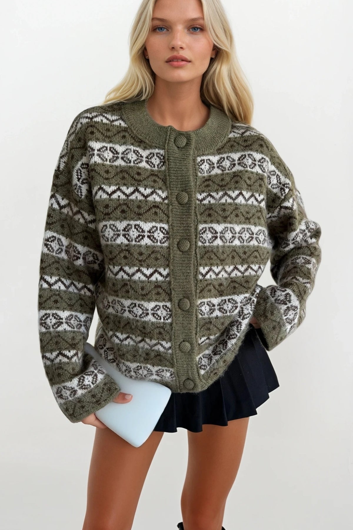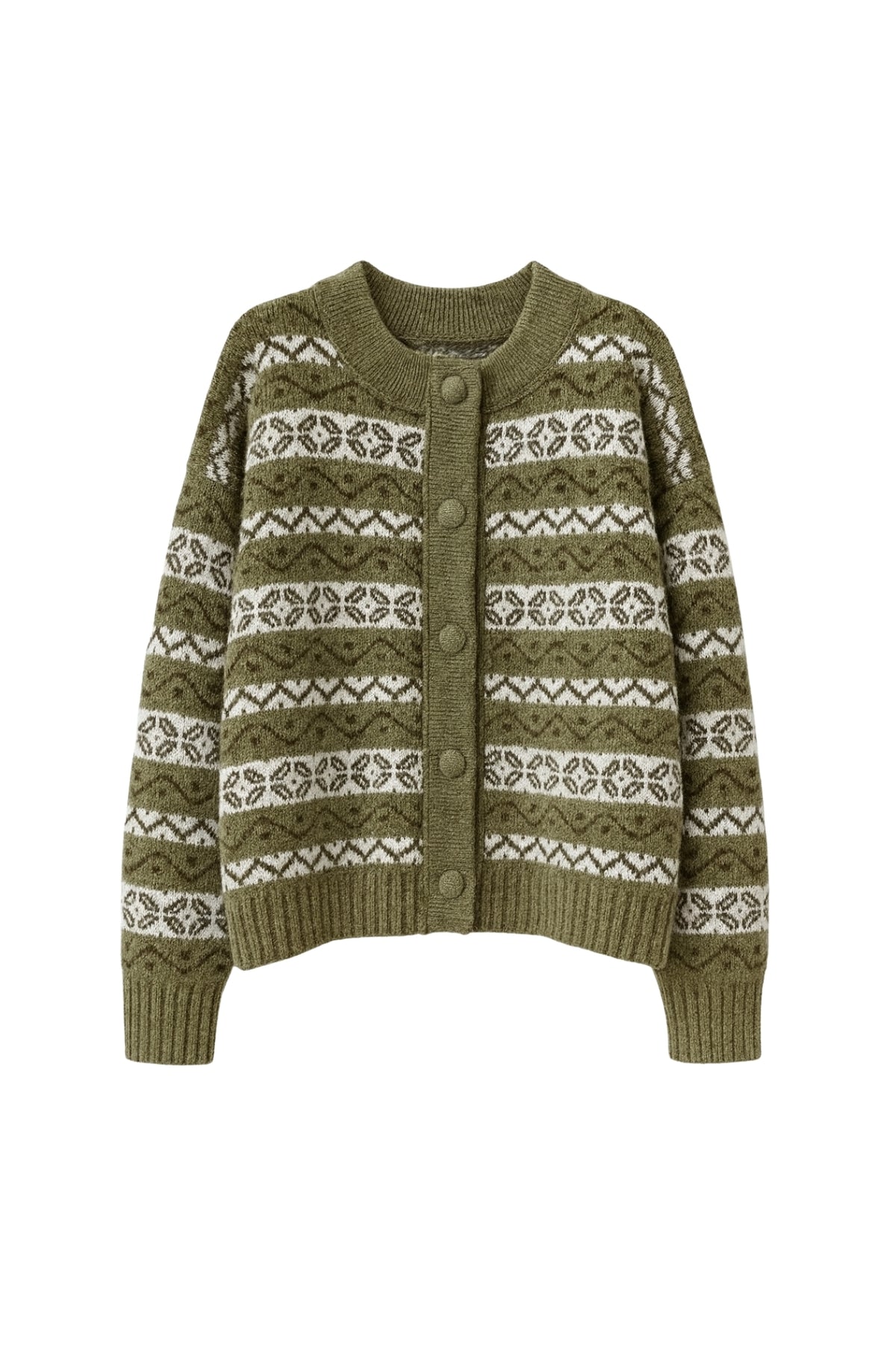 Etnik Desen Yeşil Şardonlu Triko Hırka