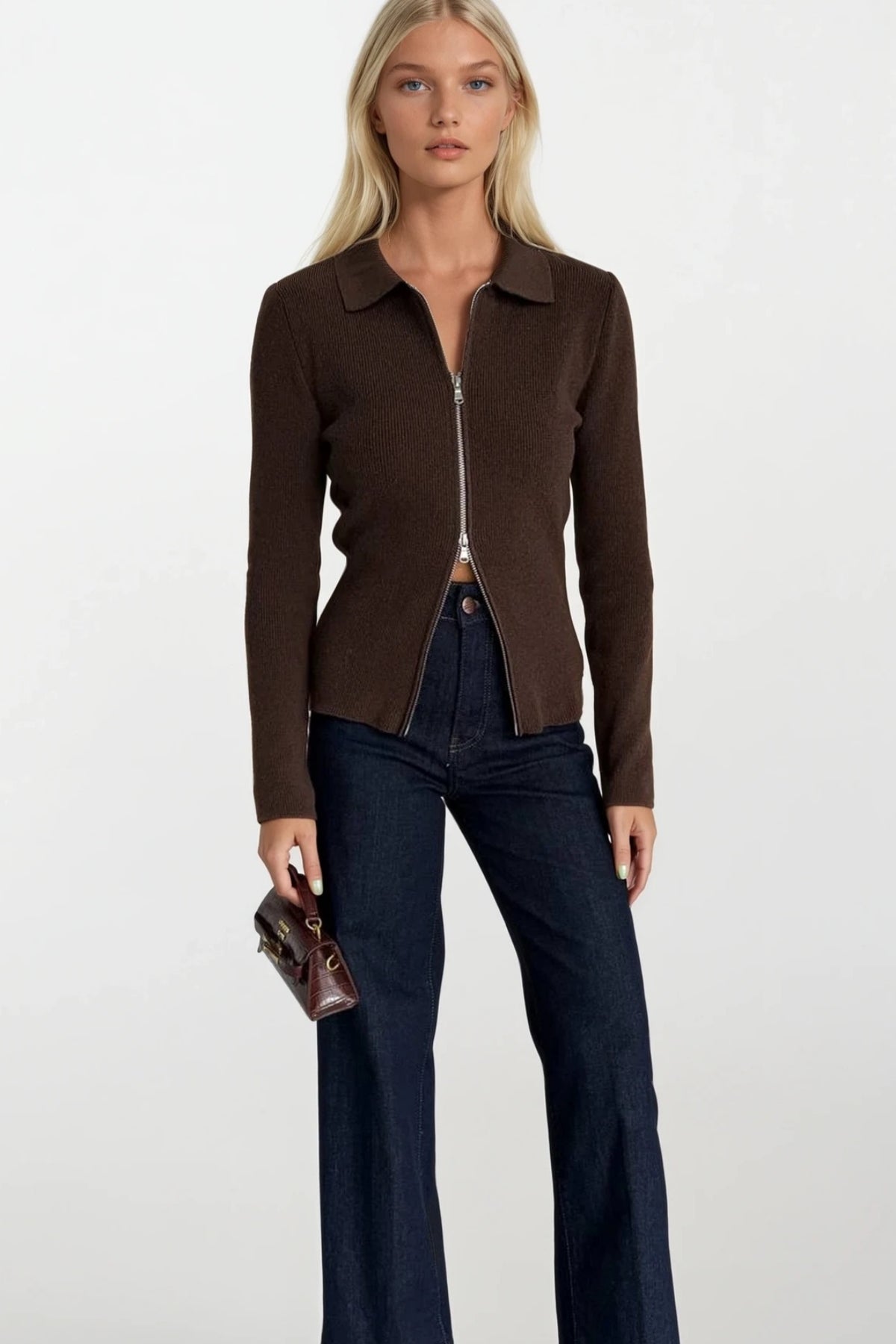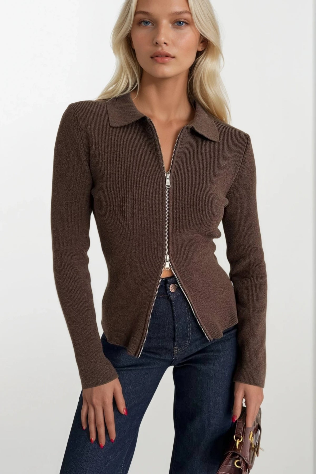 Şıklığı ve konforu bir arada sunan polo yaka çift fermuarlı triko bluz, gardırobunuzun vazgeçilmez parçası olmaya aday. Kahverengi tonuyla her kombine uyum sağlayan bu özel tasarım, modern kadının dinamik yaşam tarzına eşlik ediyor.