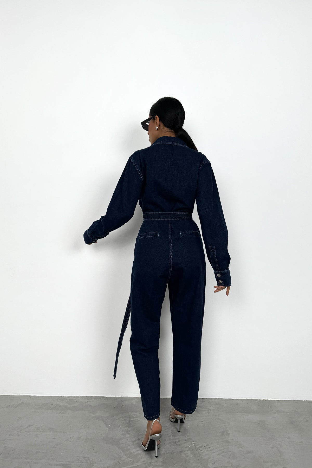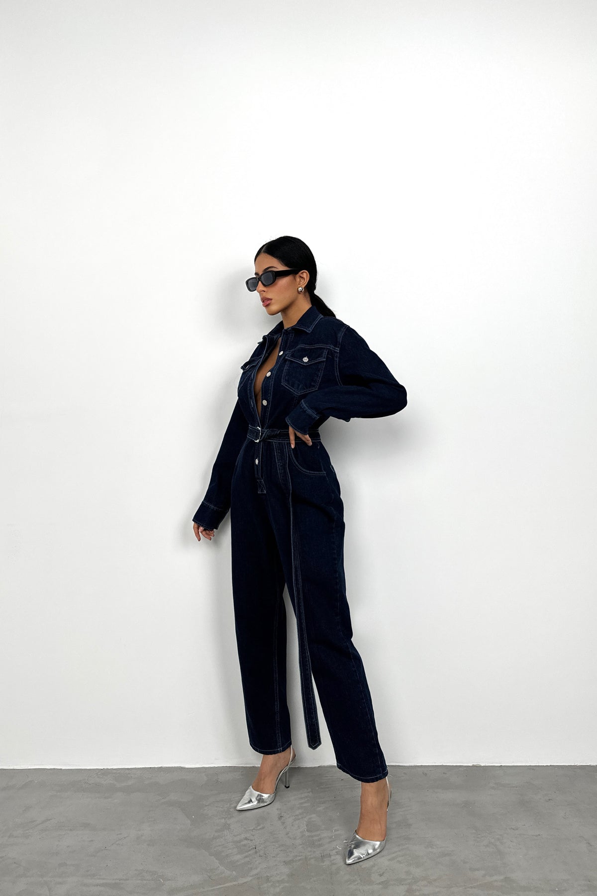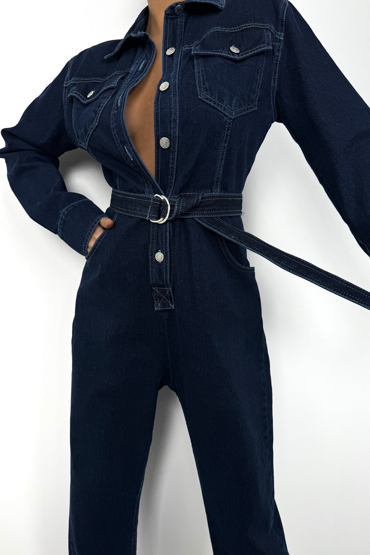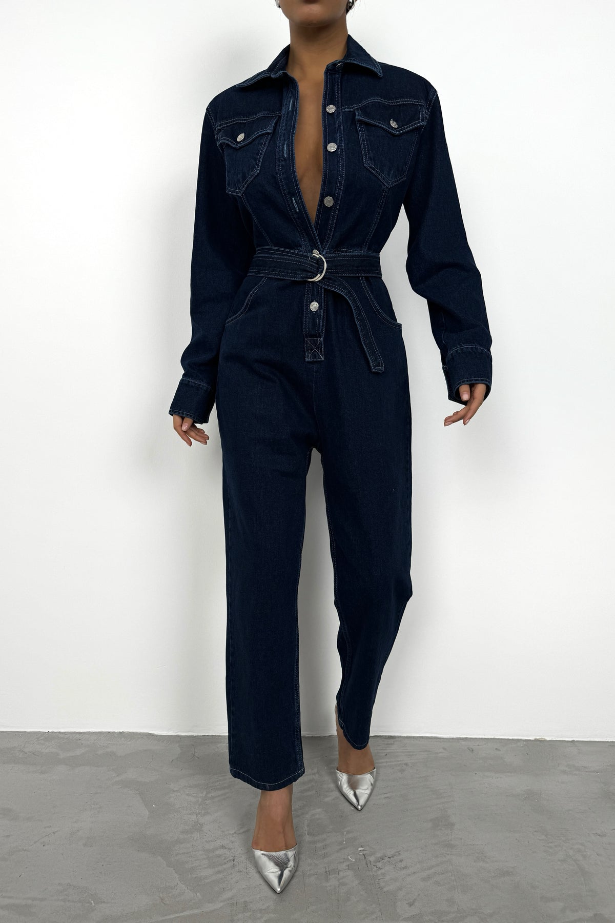 Kemer Detay, Gömlek Yaka, Uzun Kollu, Metalik Düğmeli, Denim, Tulum