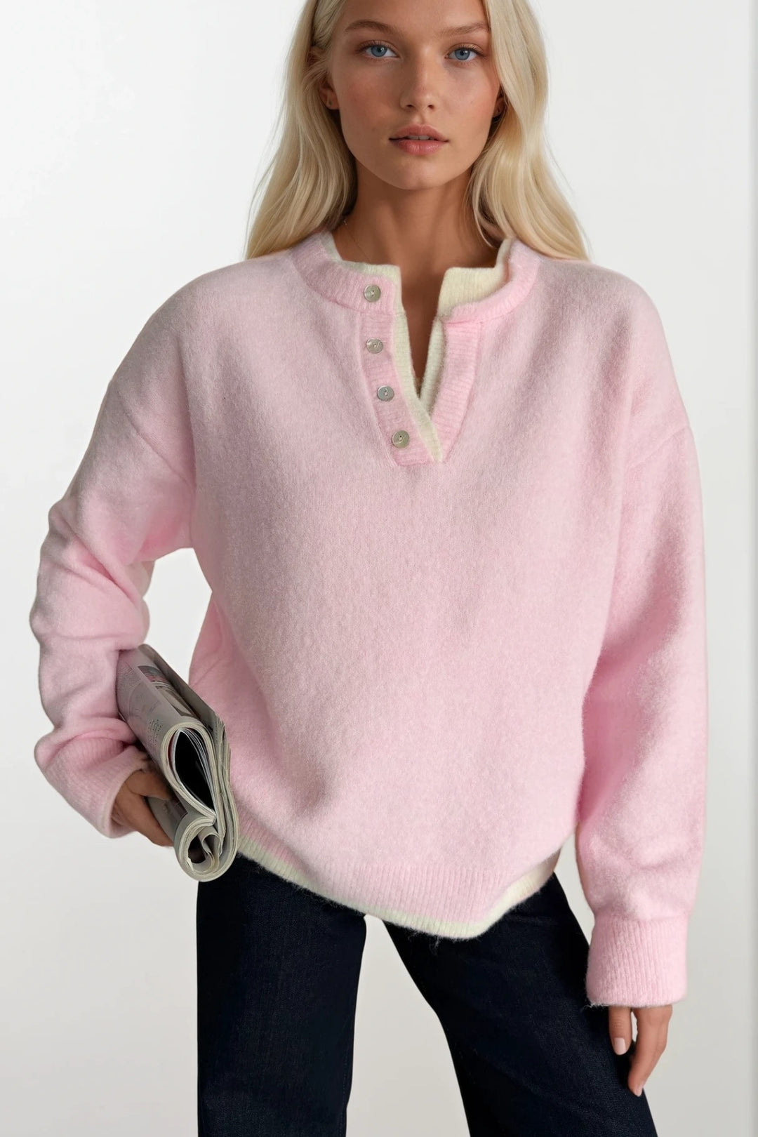 Polo Yaka Ekru Düğmeli Triko Kazak