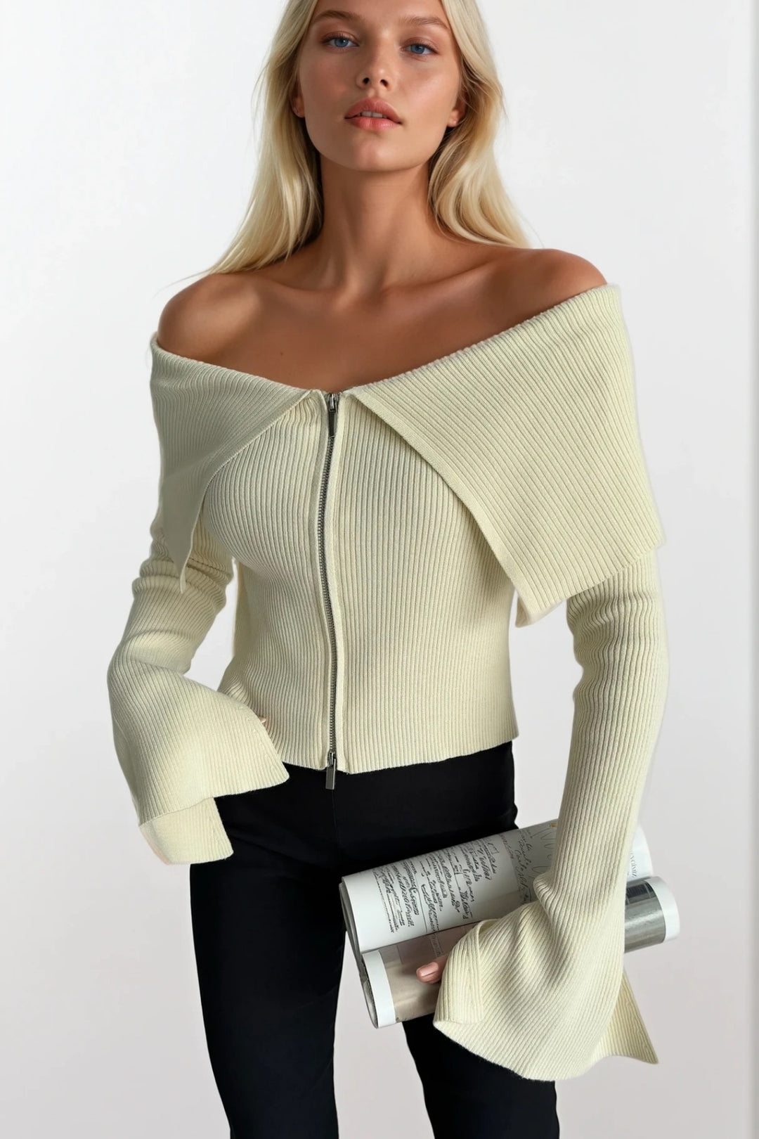 Madonna Yaka Ekru Fermuarlı Triko Bluz