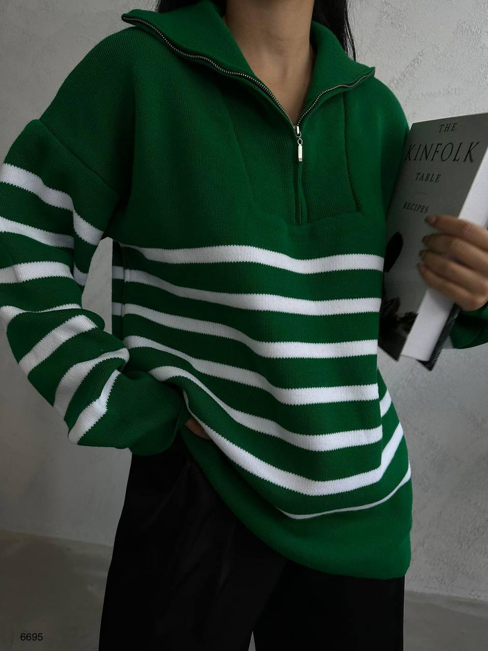 Yaka Fermuar Detay Yeşil Oversize Kazak